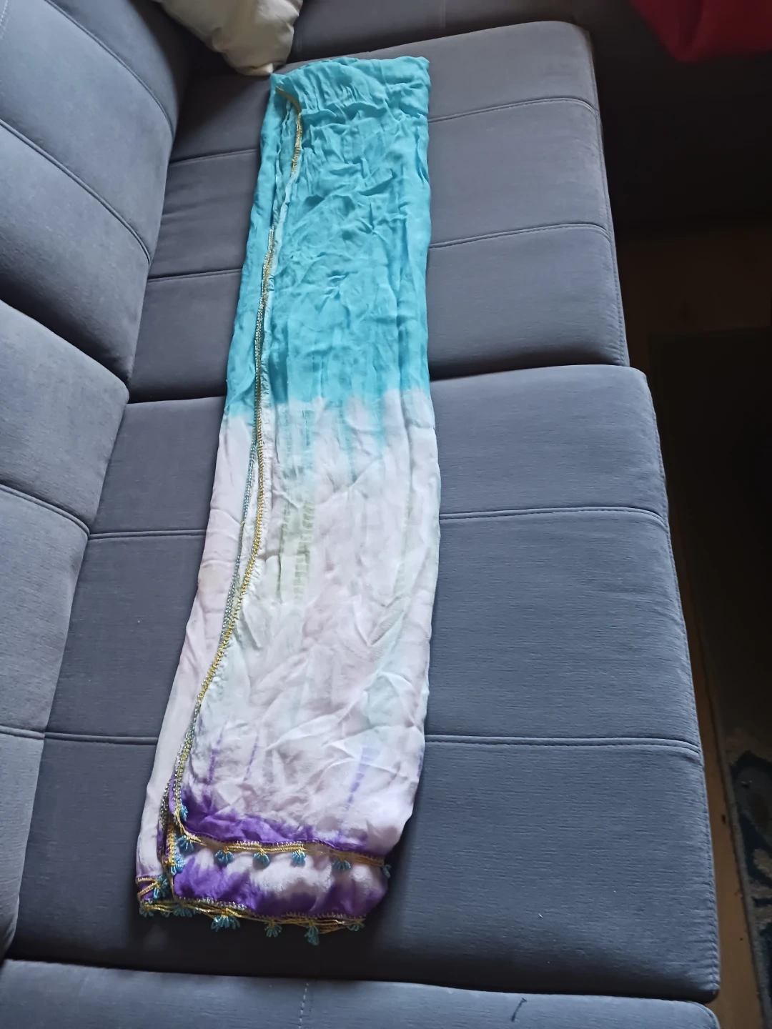 A beautiful, lightweight scarf with a watercolour tie-dye effect in shades of purple, blue, and green. It features a delicate gold and blue beaded trim along the edge. This accessory adds a pop of colour to any outfit!