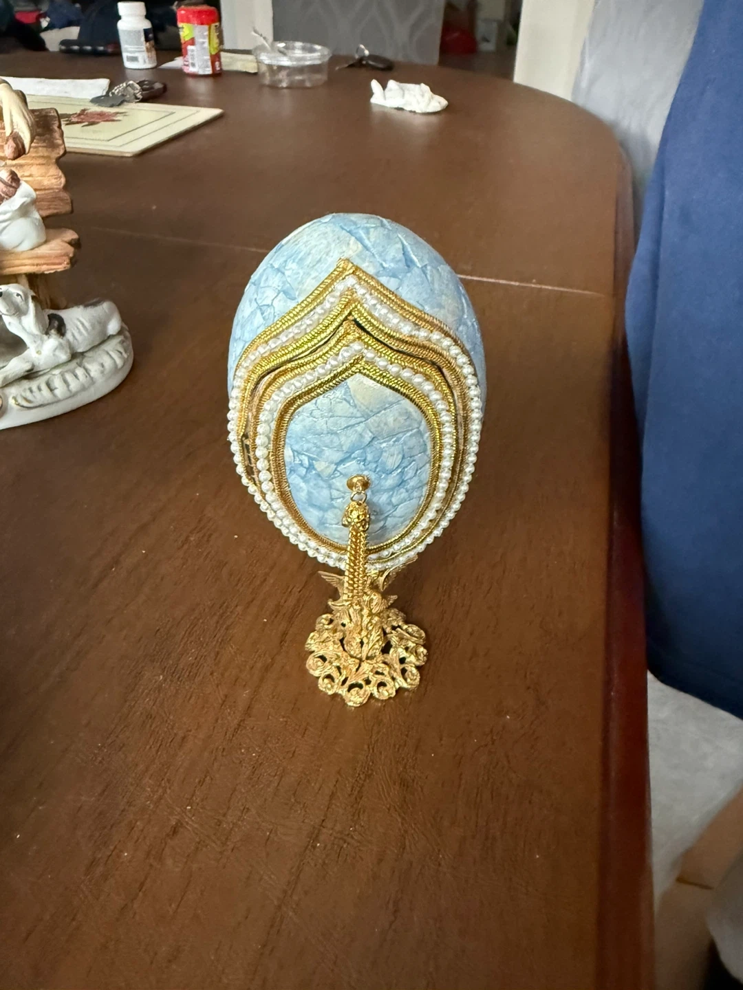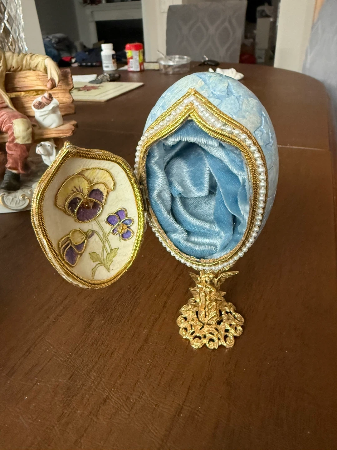 Beautiful decorative egg with a Fabergé style design. It's adorned with gold trim and pearl accents and opens to reveal a blue velvet interior. The lid features a hand-painted pansy design.