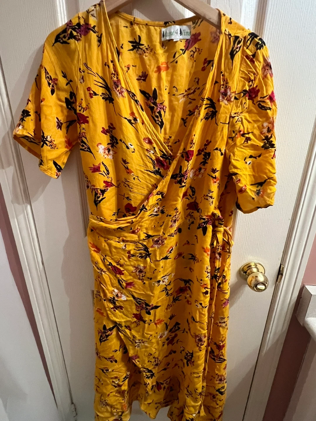 This is a yellow wrap dress with a floral print. It features short sleeves and a tie waist for an adjustable fit. The fabric is lightweight and drapes nicely.