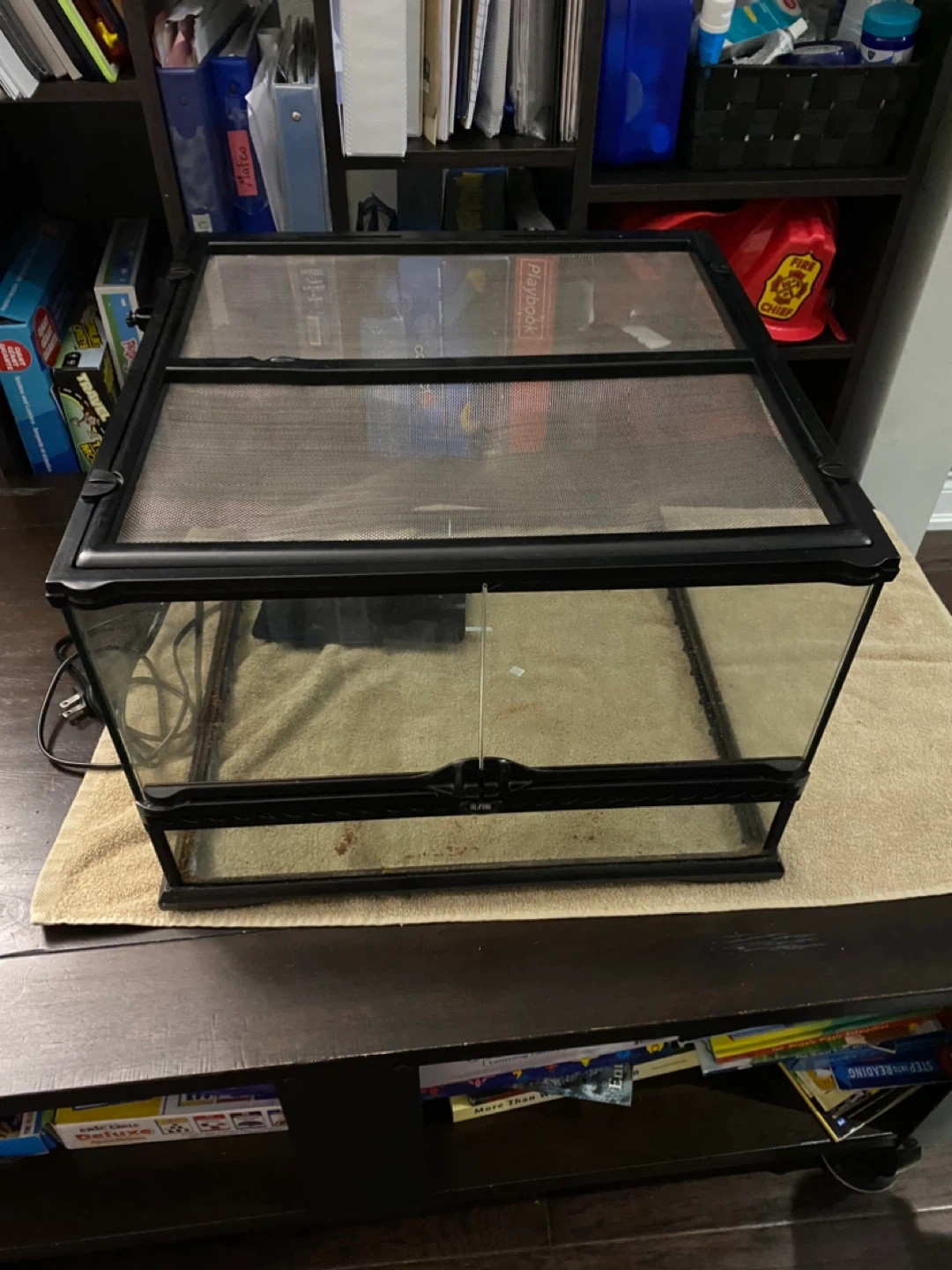 This is a glass terrarium habitat tank. It features a front-opening dual door for easy access. The screened top allows for ventilation. It's suitable for various reptiles and small animals.