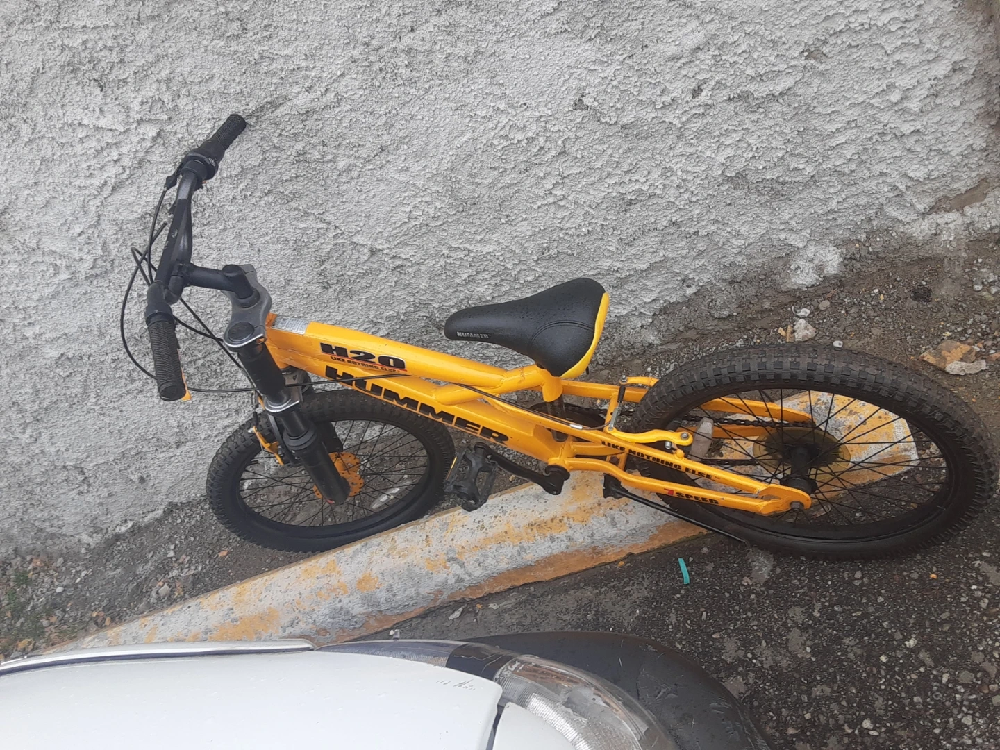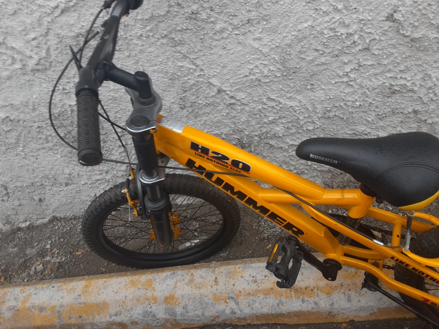 Yellow Hummer H20 kids bike. It's a 7-speed bicycle with front suspension and a rear fender. This bike is designed for younger riders. As is condition