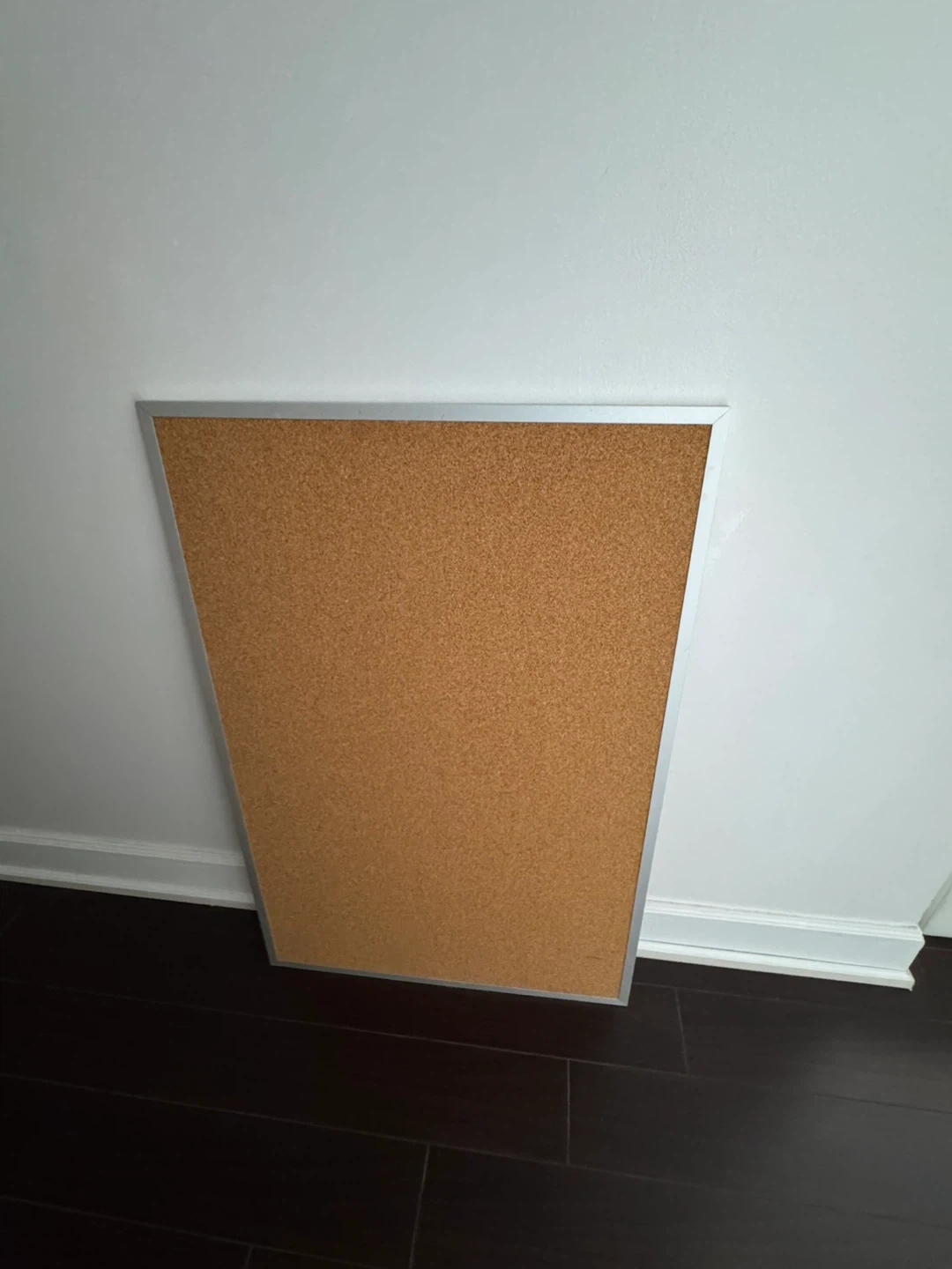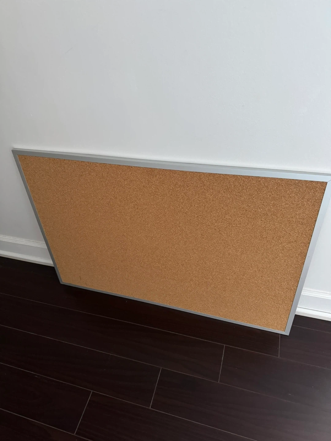 This is a cork bulletin board with a silver metal frame. It's perfect for pinning notes, photos, or reminders. The board measures approximately 24 inches by 36 inches.