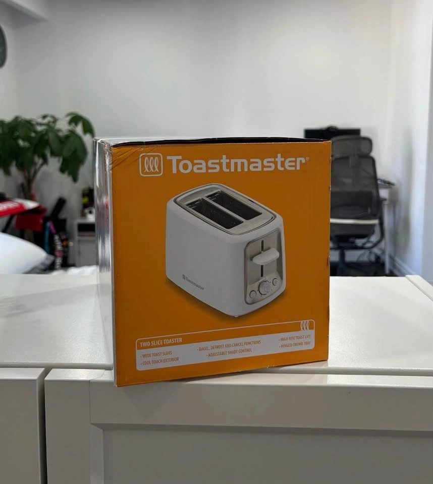 Toastmaster 2-slice toaster, used a few times only and includes everything inside the box. Features adjustable browning control, defrost and bagel functions, and wide slots for different types of bread. Simple and easy to use with a clean white design. Perfect for home, dorm, or small kitchen.