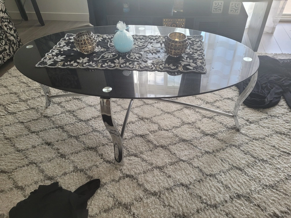 Selling a sleek black glass oval coffee table with chrome legs. It's in great shape and would look lovely in any living room!
