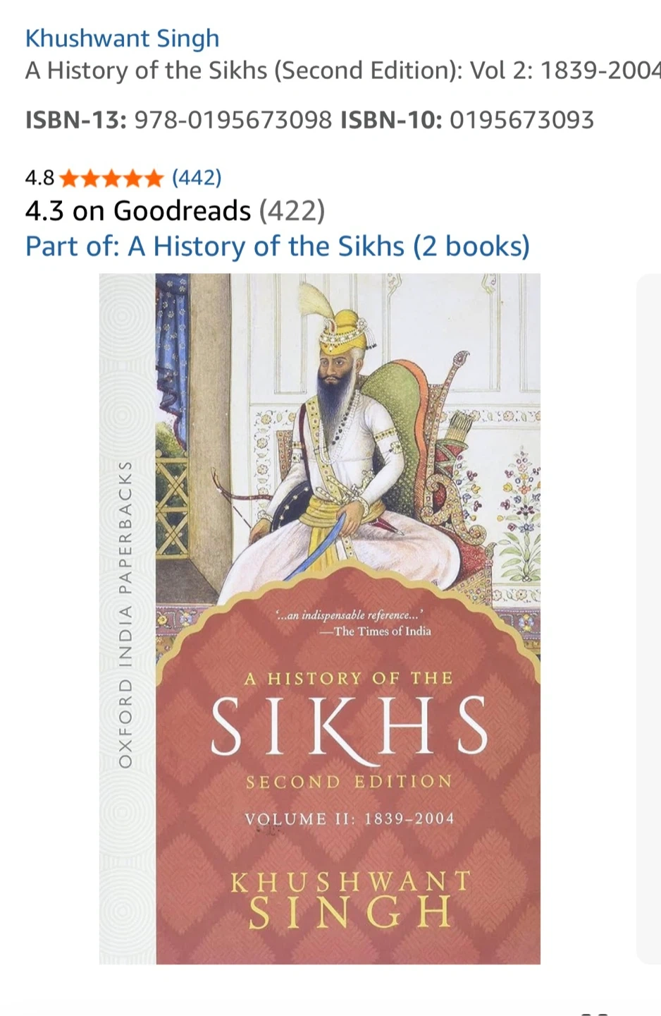 This is a two-volume set of 'A History of the Sikhs' by Khushwant Singh. Both books are the Second Edition. Volume 1 covers 1469-1839, and Volume 2 covers 1839-2004. They are Oxford India Paperbacks.