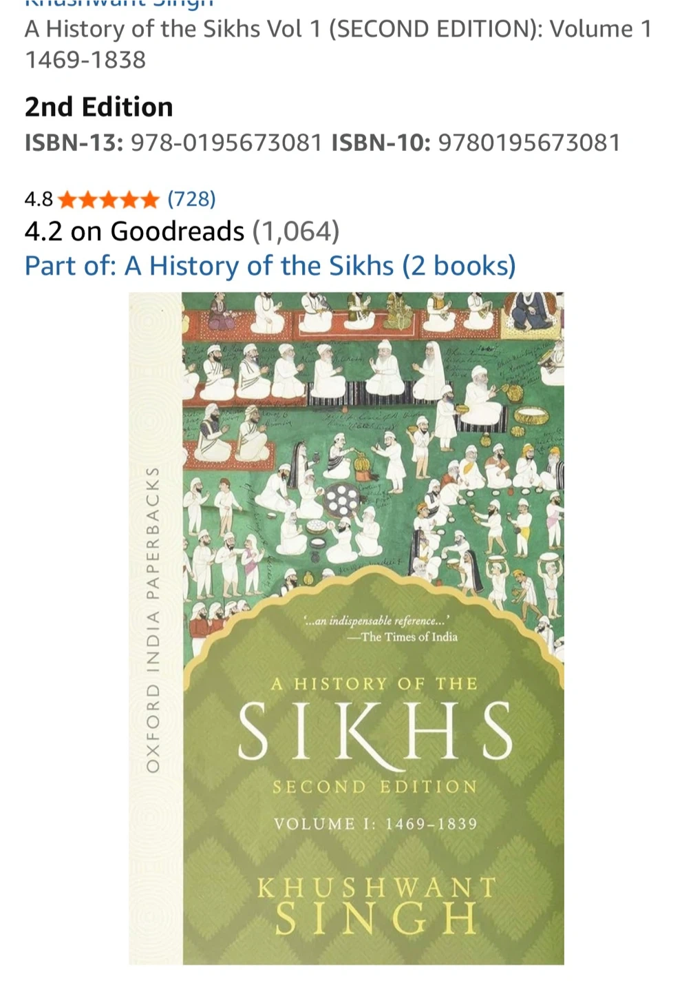 This is a two-volume set of 'A History of the Sikhs' by Khushwant Singh. Both books are the Second Edition. Volume 1 covers 1469-1839, and Volume 2 covers 1839-2004. They are Oxford India Paperbacks.