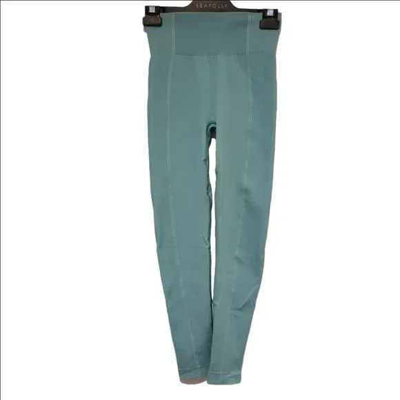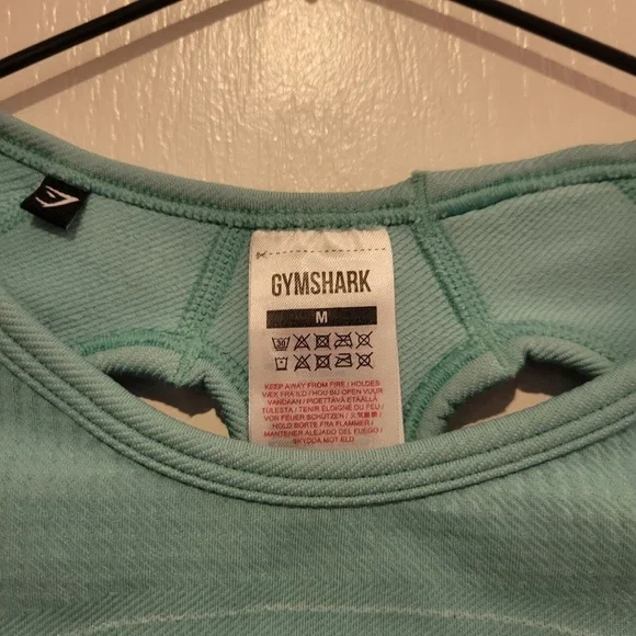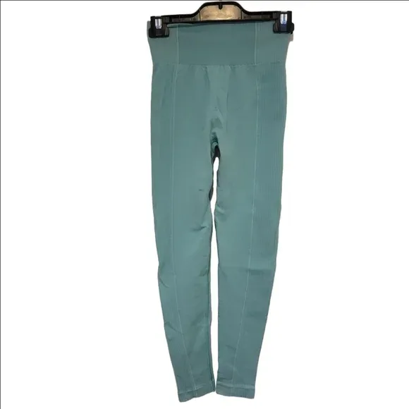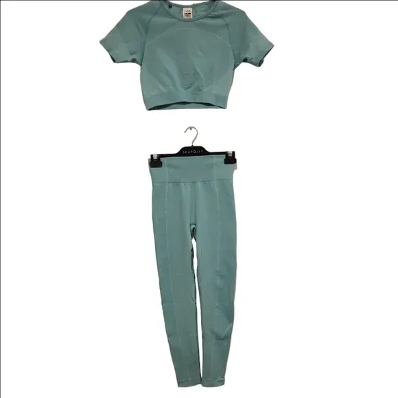 Selling a cute Gymshark workout set in size Med Top and Small Bottoms! The set includes leggings and a matching top, both in a lovely light blue/green colour. Perfect for your next gym session or yoga class! The material is comfortable and stretchy.