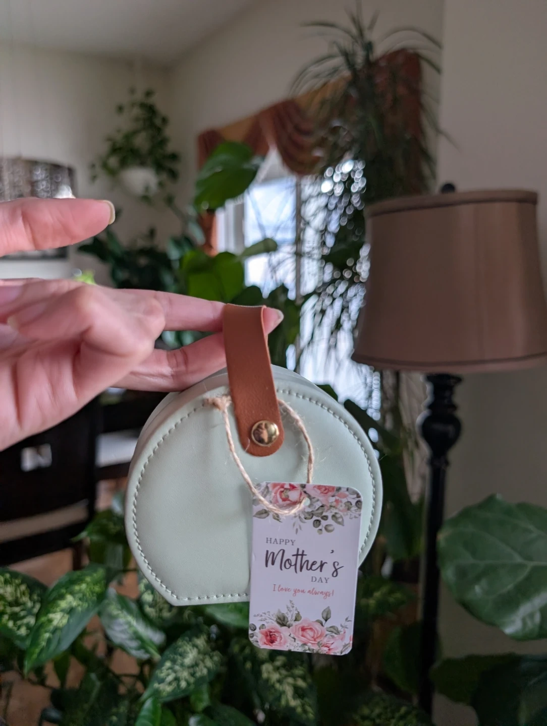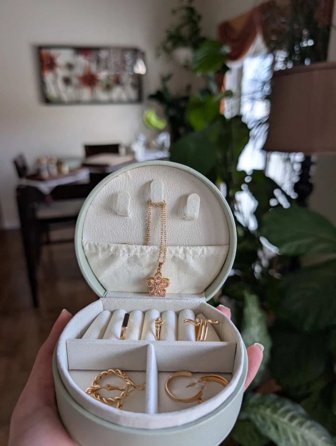 This mint green jewellery box is perfect for storing your rings, earrings, and necklaces. It's compact and round, making it easy to take on the go. The inside is lined with soft fabric to protect your precious items. Makes a great gift!