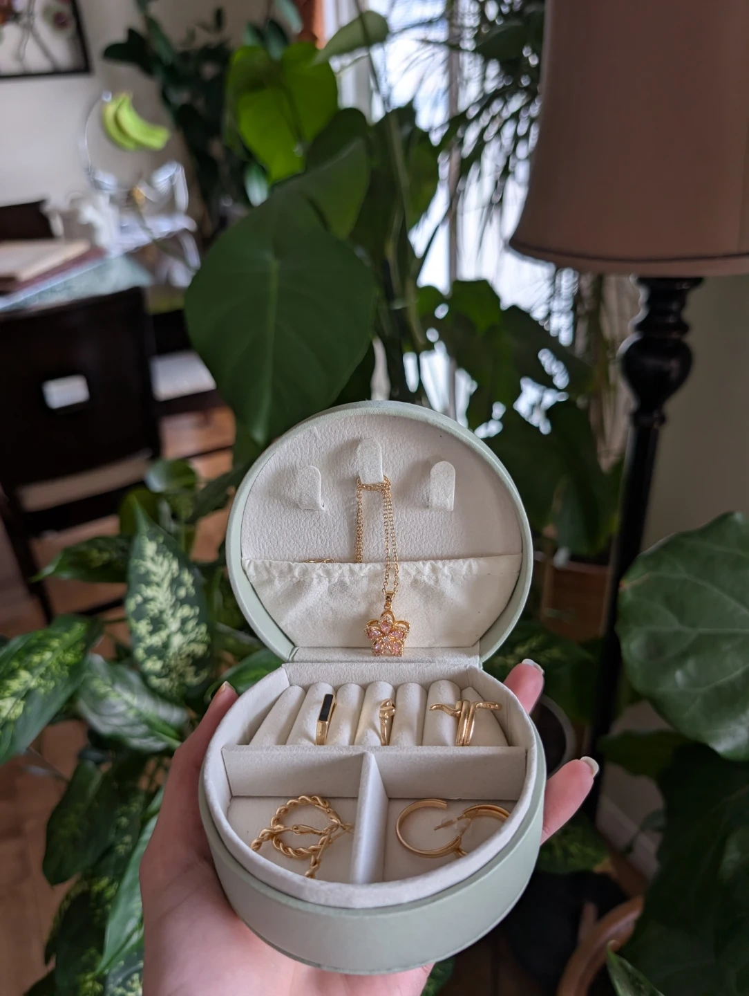 This mint green jewellery box is perfect for storing your rings, earrings, and necklaces. It's compact and round, making it easy to take on the go. The inside is lined with soft fabric to protect your precious items. Makes a great gift!