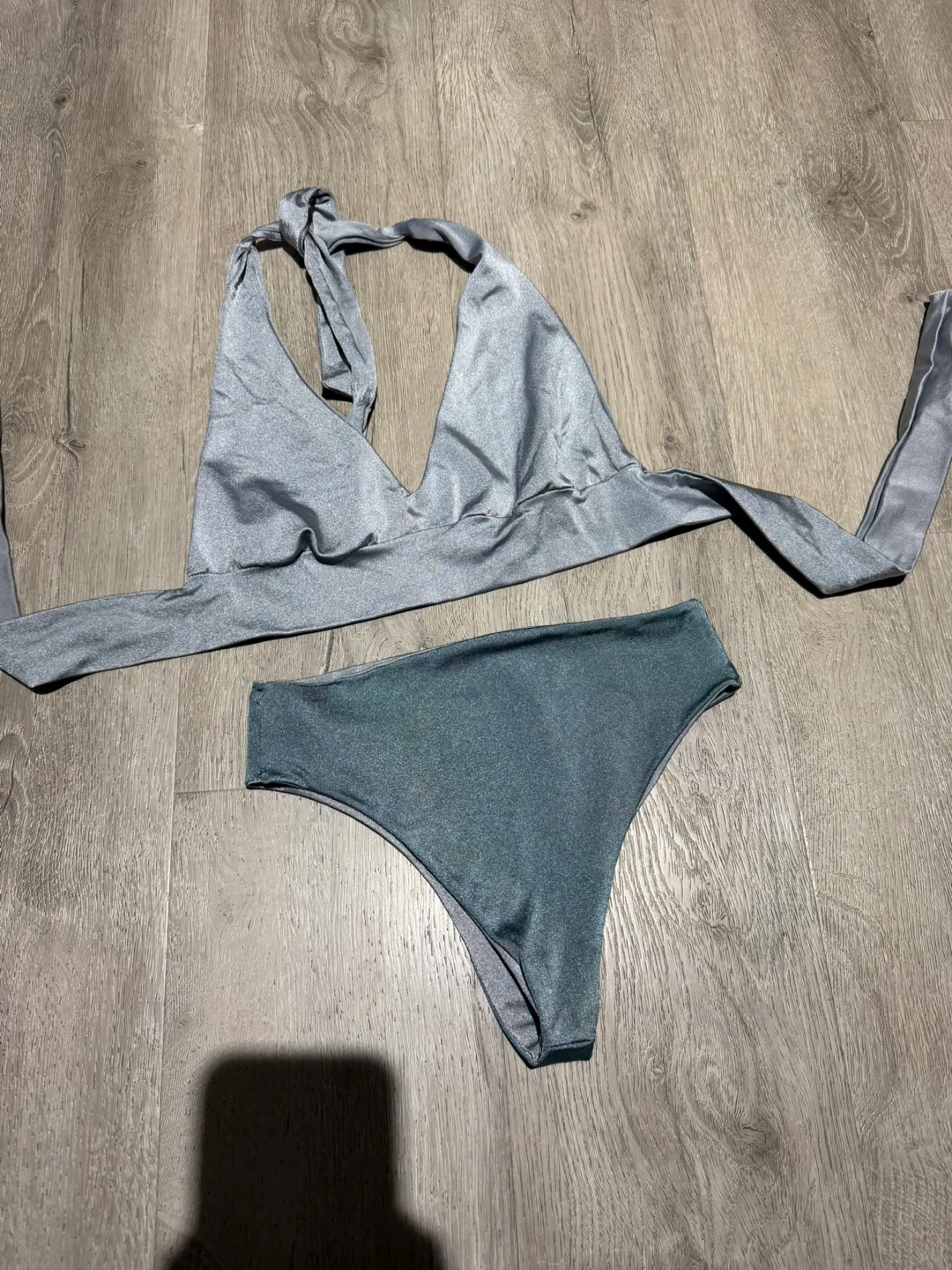 A shimmering grey two-piece bikini set. It's made of a stretchy, shiny material. This swimwear is perfect for lounging by the pool or hitting the beach!