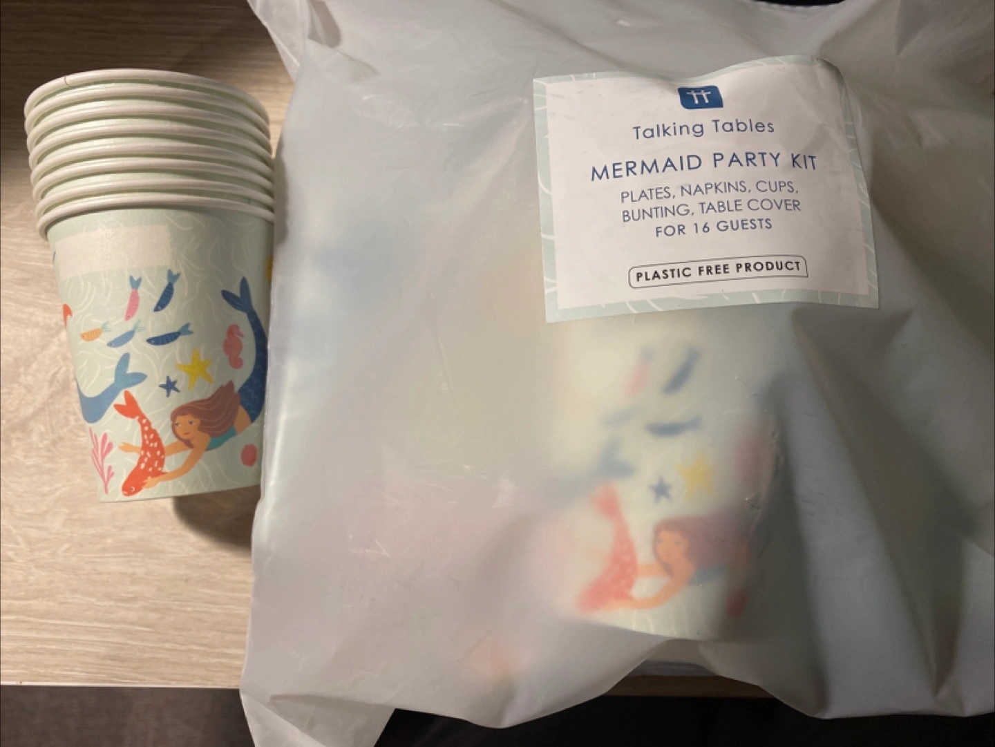 Unused Mermaid party kit. Includes plates, napkins, cups, bunting, and table cover. Plastic-free product. For 16 guests.