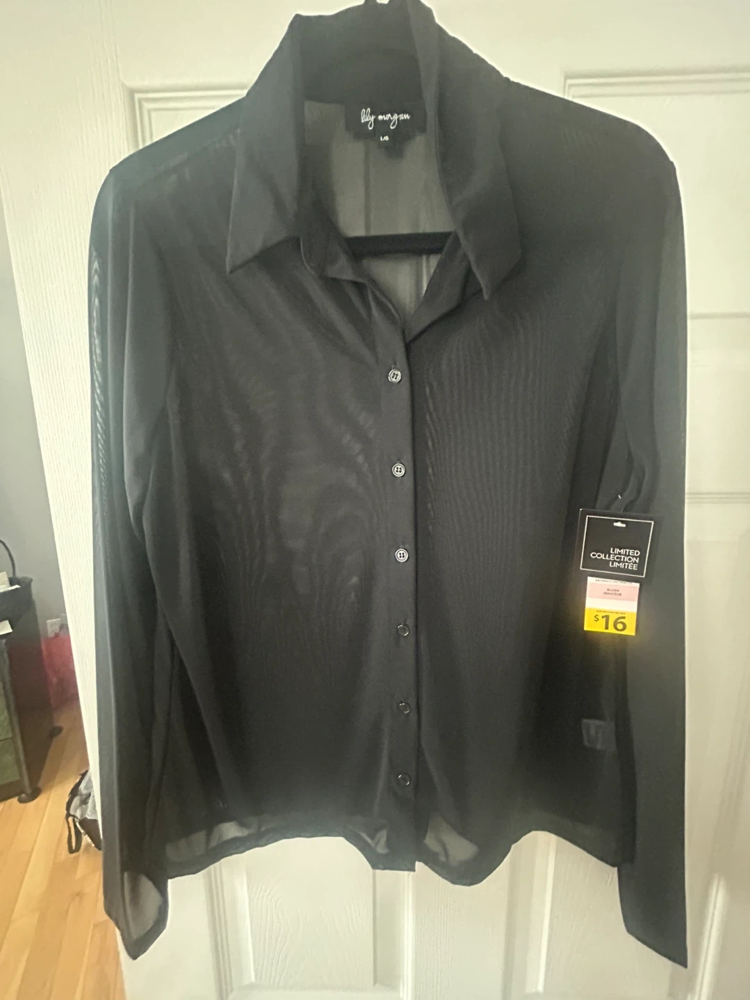 New Lily Morgan sheer black button-up shirt. Size is large. This shirt is made of a mesh material. Tags still on