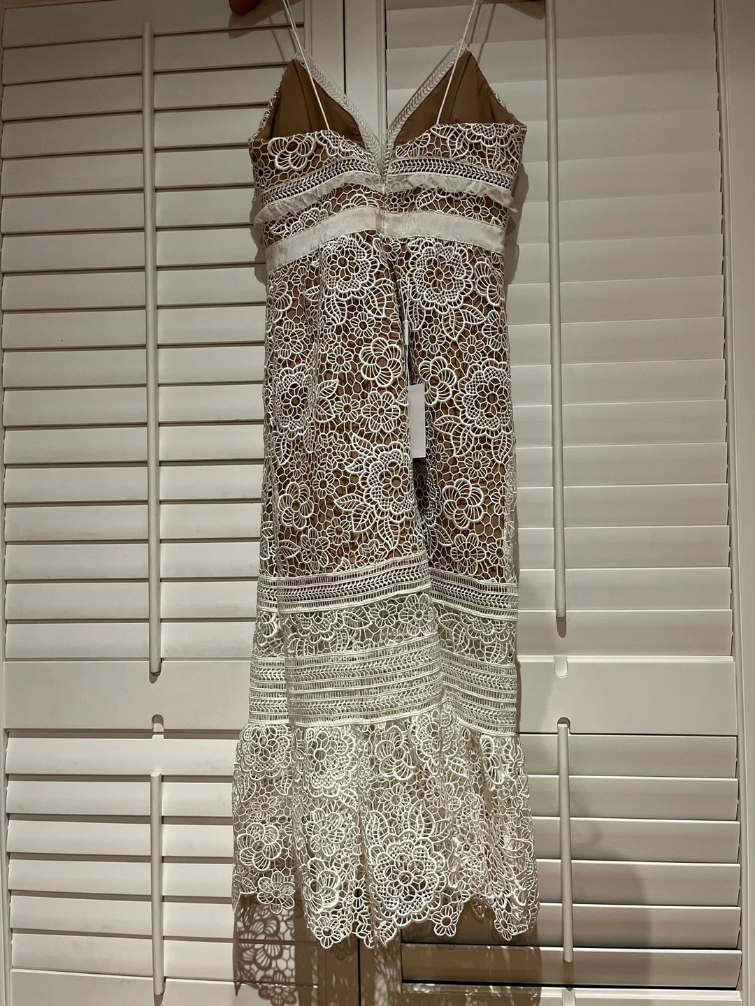White lace midi dress with a V-neckline and spaghetti straps. Never worn.