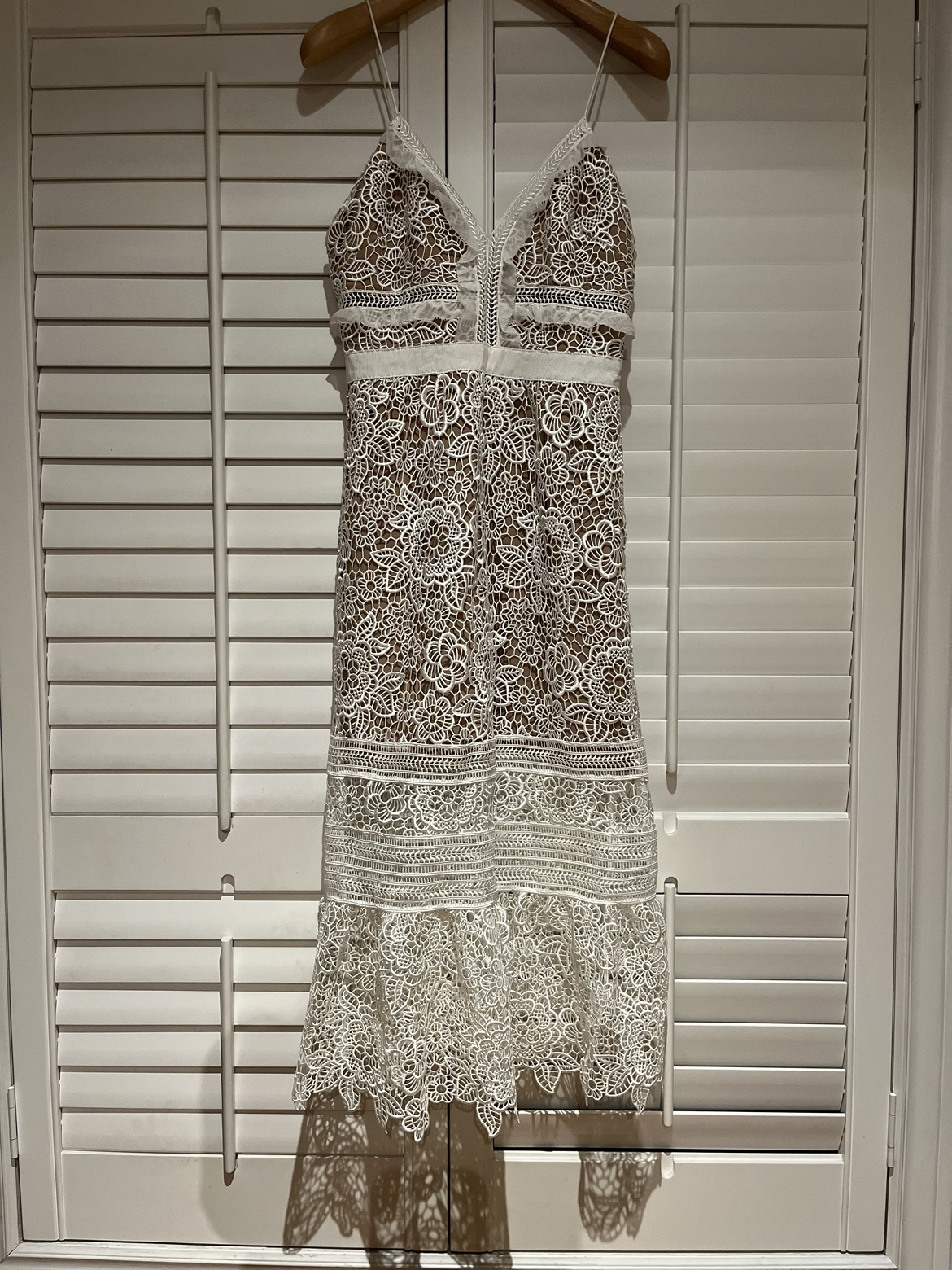 White lace midi dress with a V-neckline and spaghetti straps. Never worn.