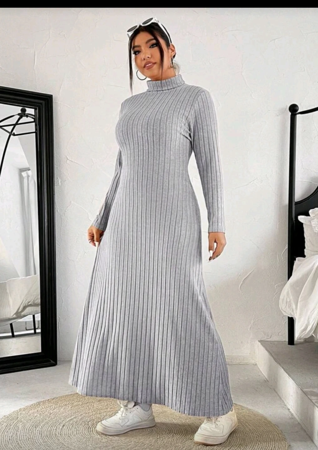 A ribbed knit maxi dress with a turtleneck and long sleeves. It's made of a soft, stretchy fabric.