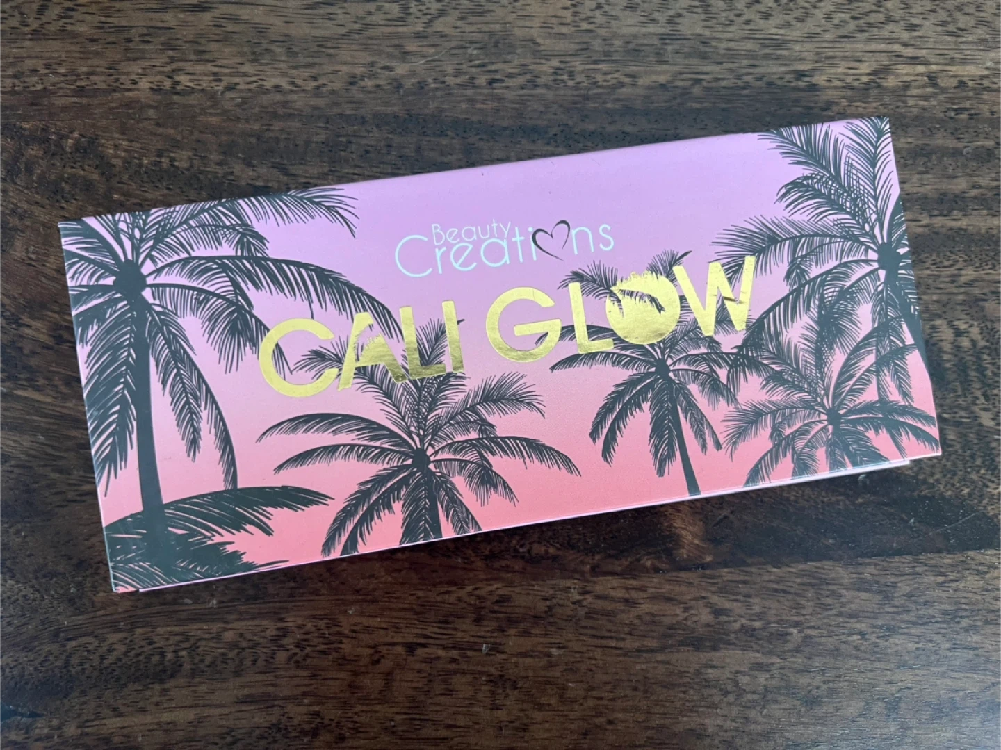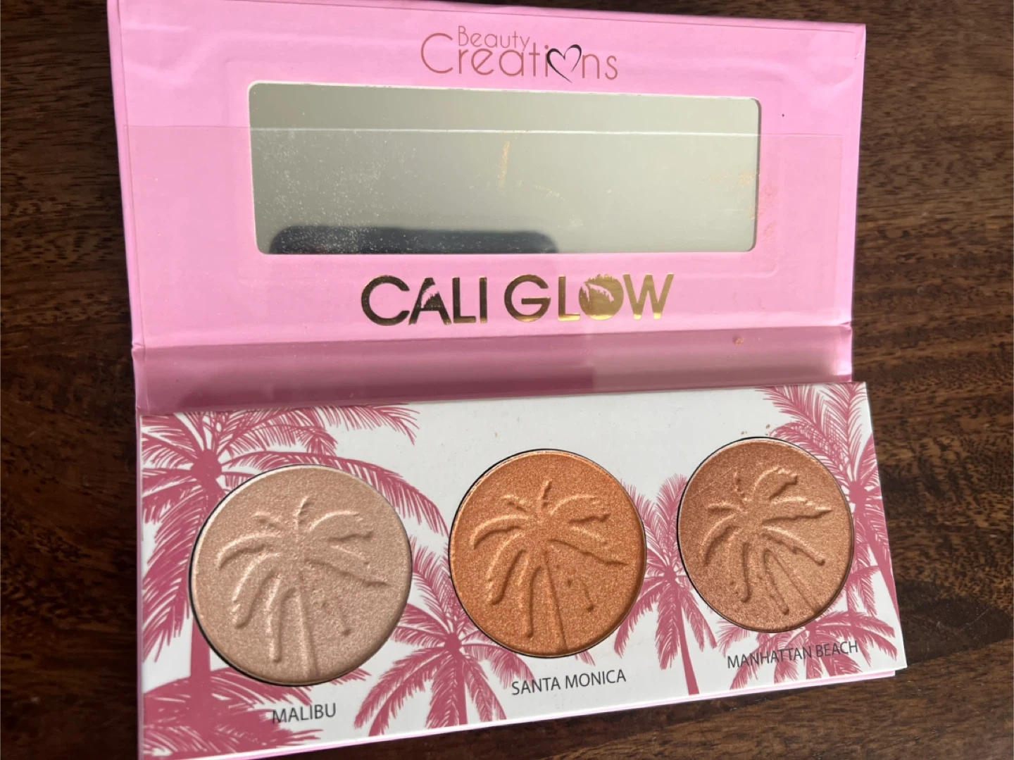 This is the Cali Glow highlighter palette from Beauty Creations. It contains three shades: Malibu, Santa Monica, and Manhattan Beach. Each shade has a palm tree imprint.