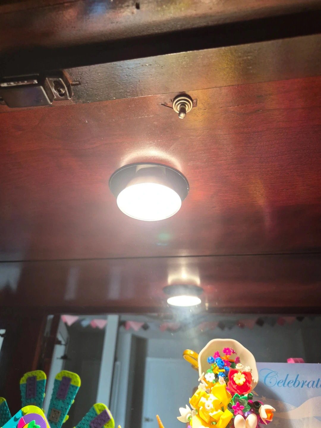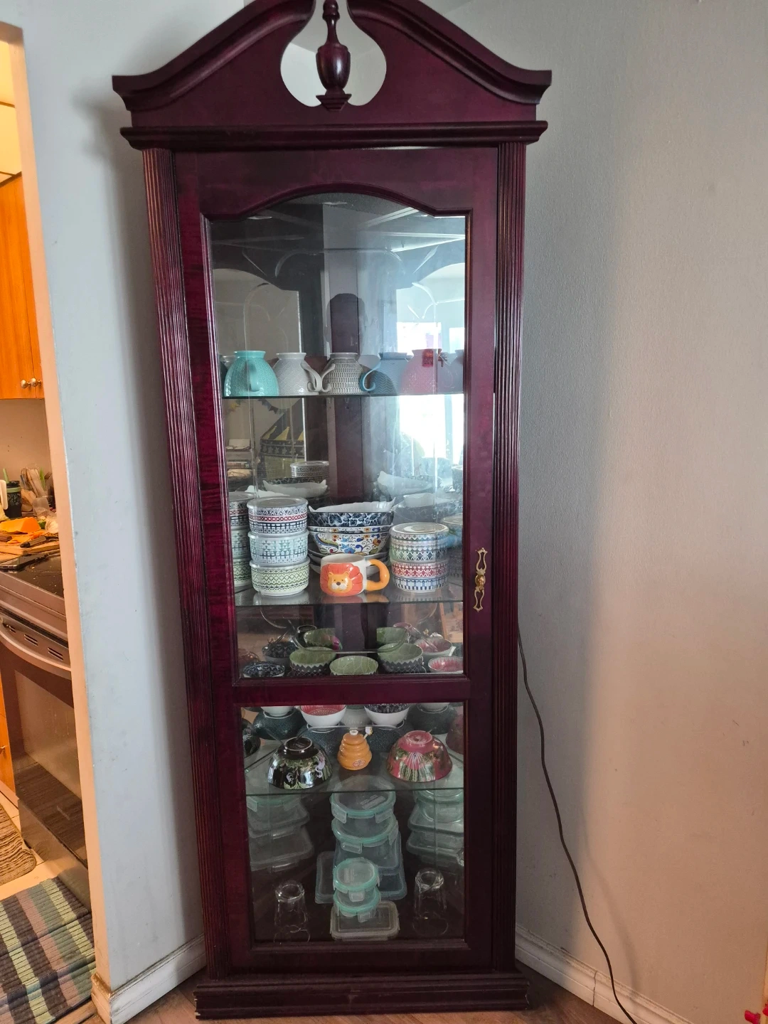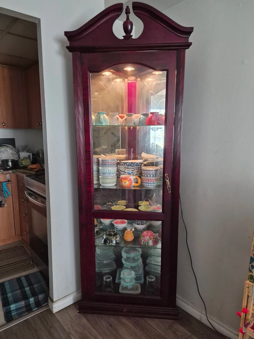 This cherry-coloured corner display cabinet features glass doors and interior lighting. It offers ample shelving(4 selves) for showcasing dishes or collectibles. A great piece for a dining room or living area!