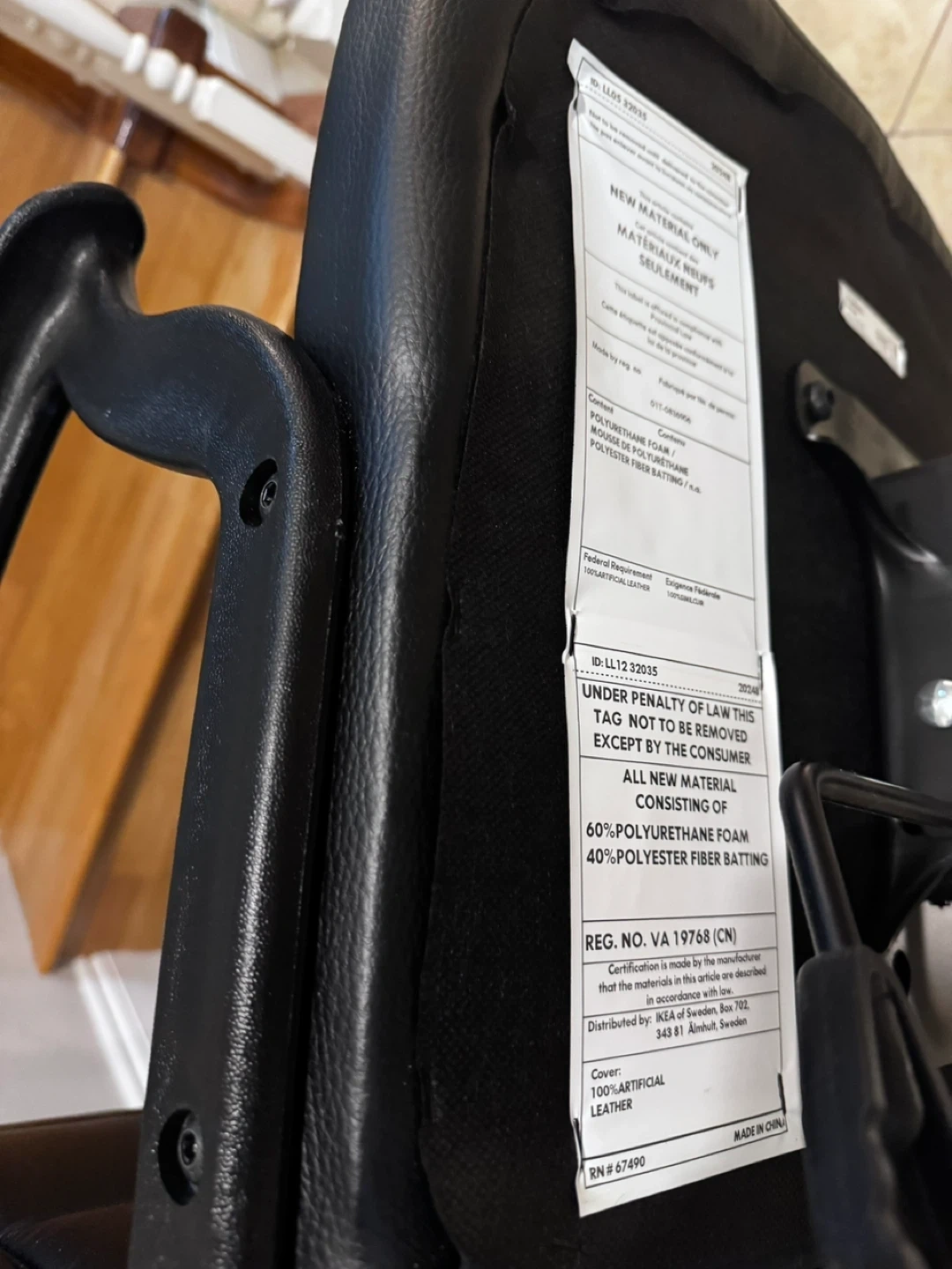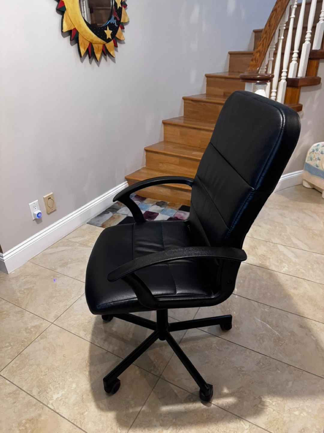 This is a black office chair with faux leather upholstery. It features a padded seat and backrest with a five-star base and casters for easy mobility. The arms are fixed.