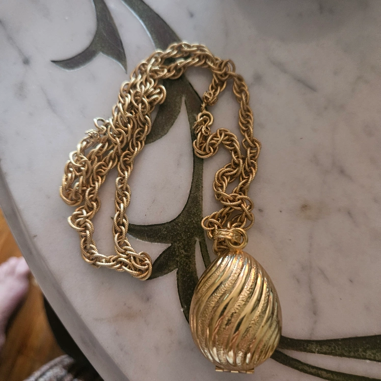 A lovely gold tone necklace. Features a locket pendant, with a decorative egg shape. The locket opens, revealing what seems to be a solid perfume. This would be a wonderful accessory for any occasion, providing a calming and elegant touch to your look.