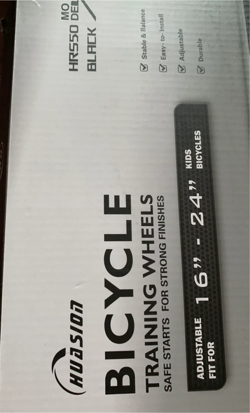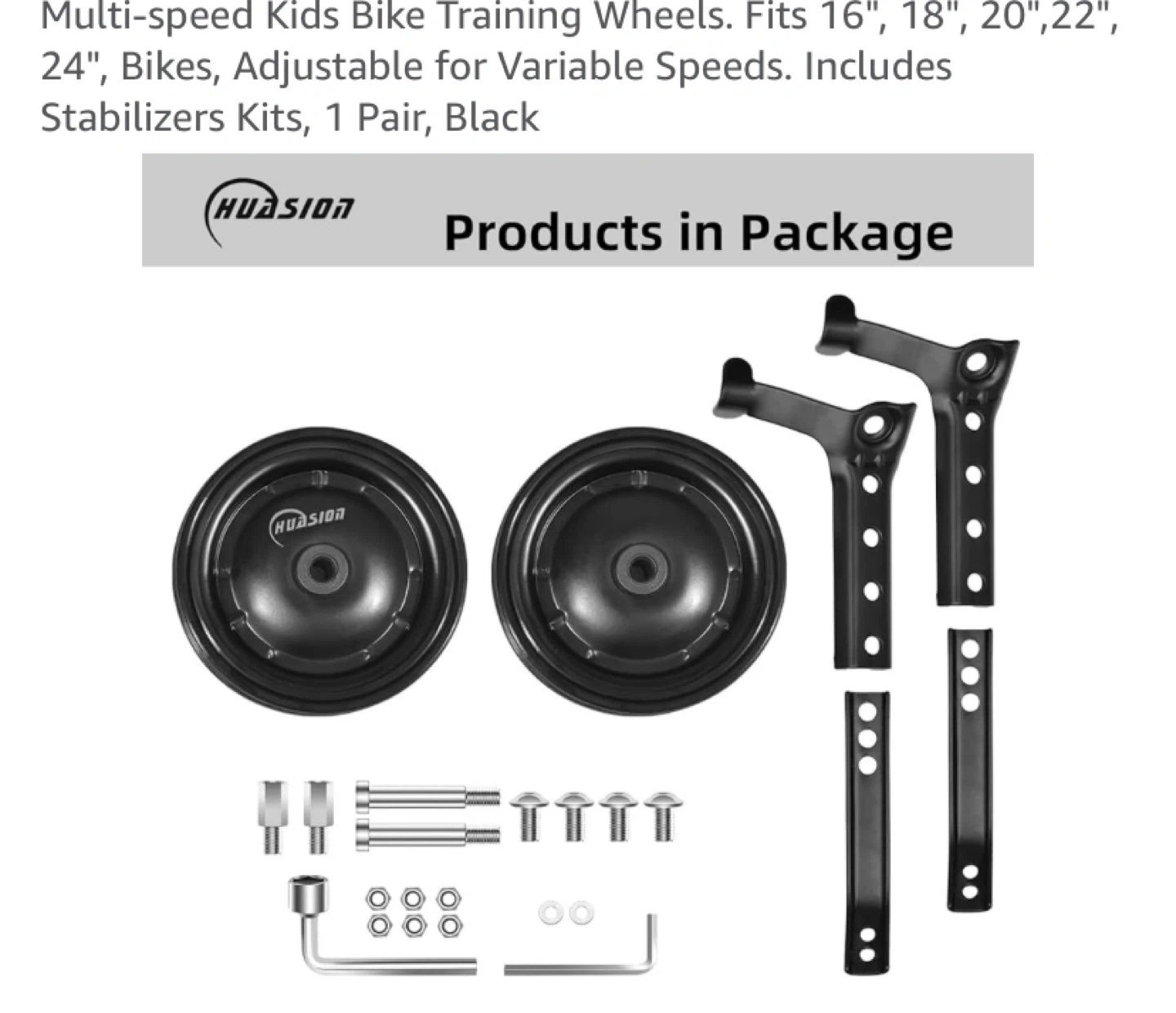 HUASION bicycle training wheels. These are adjustable and designed for kids' bikes from 16 to 24 inches. Stable and durable construction. Includes stabilizers.