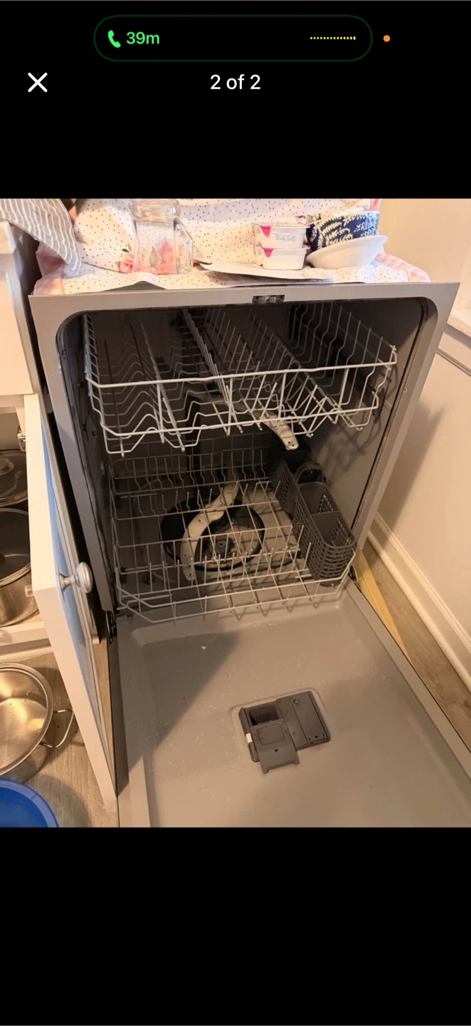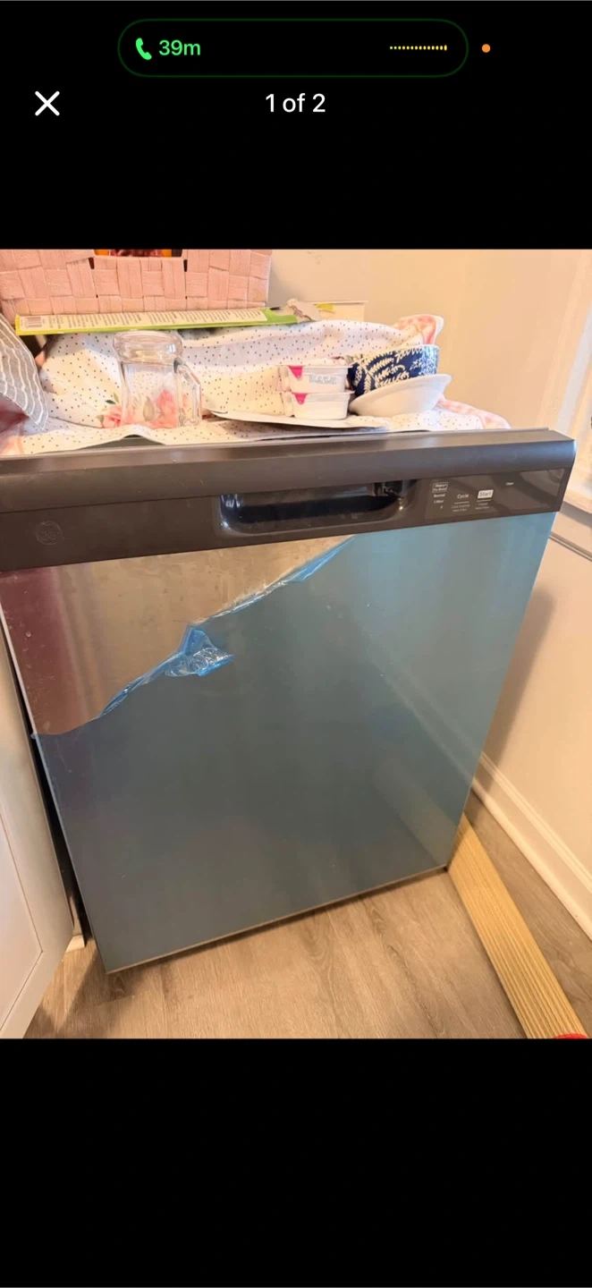 GE stainless steel dishwasher. It's a standard size with multiple racks for dishes. Interior shows good condition. Front panel has protective film still partially attached.