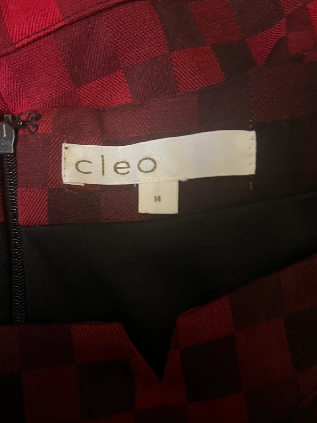 This sleeveless sheath dress from Cleo features a striking red and black checkered pattern. It has a built-in belt with a gold-tone buckle. Size 14. The fabric is a blend, offering a comfortable fit.