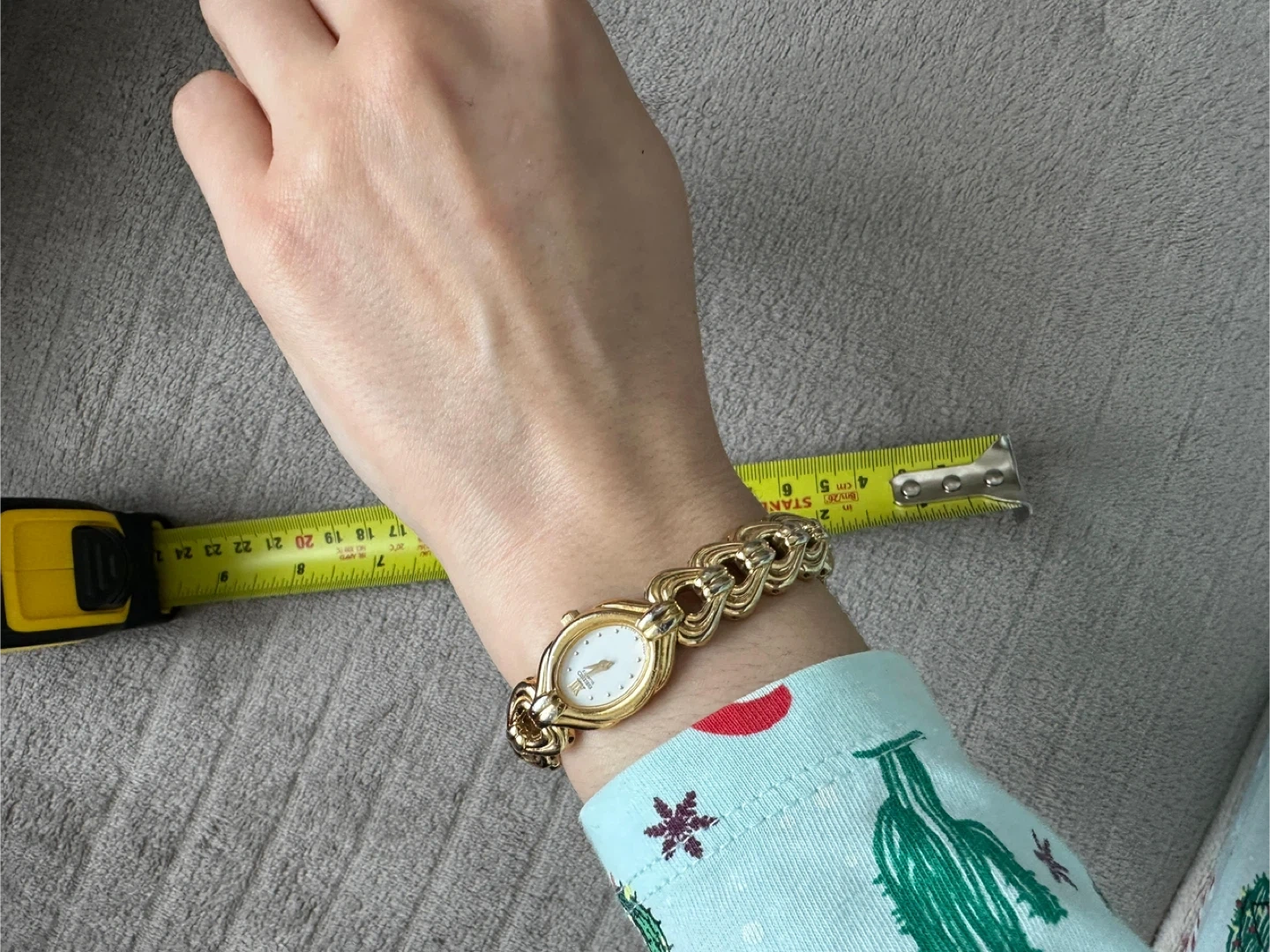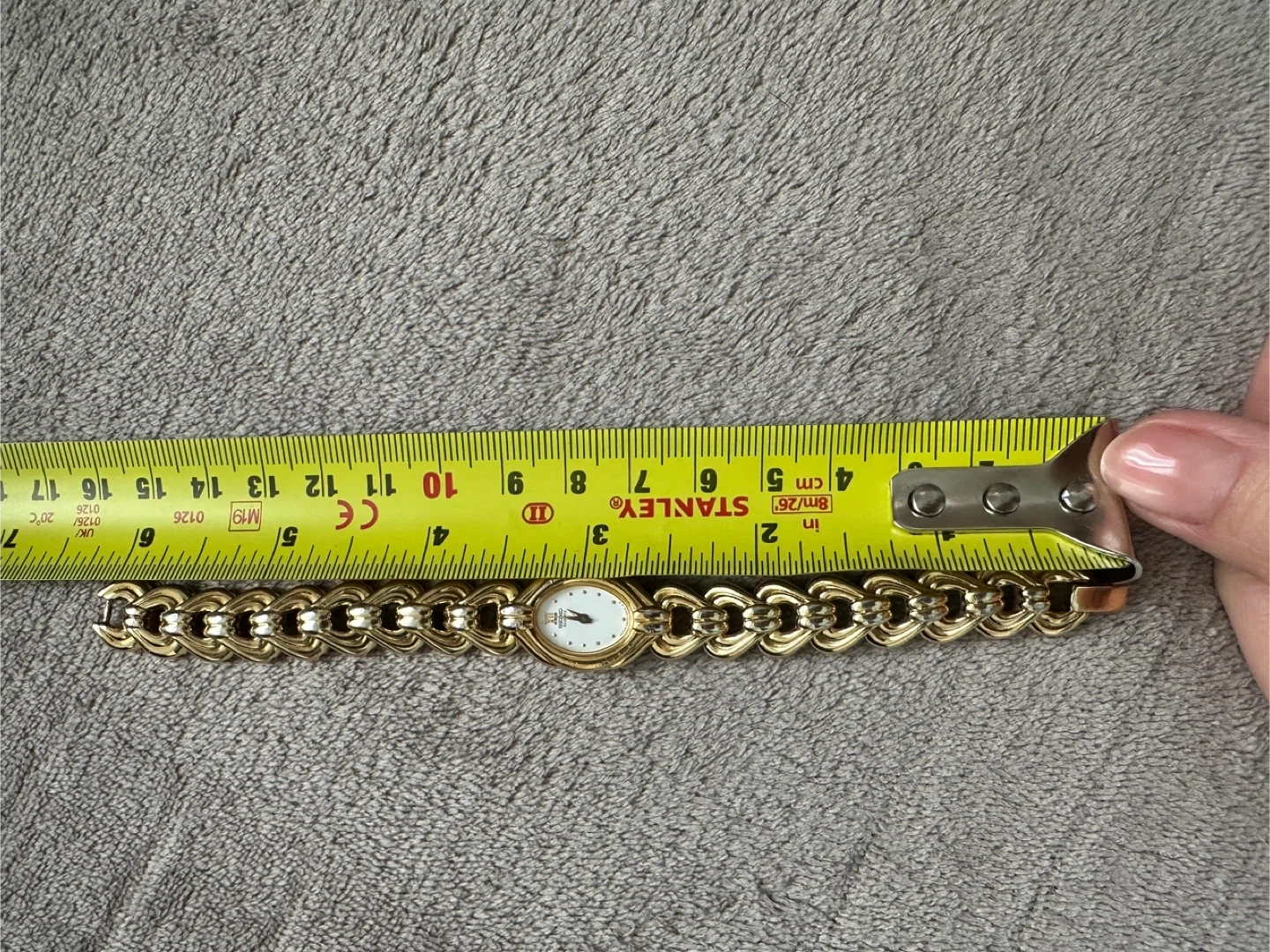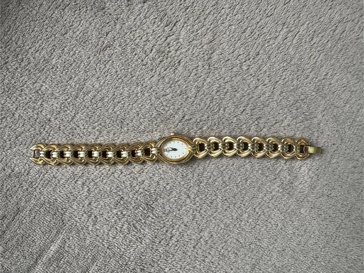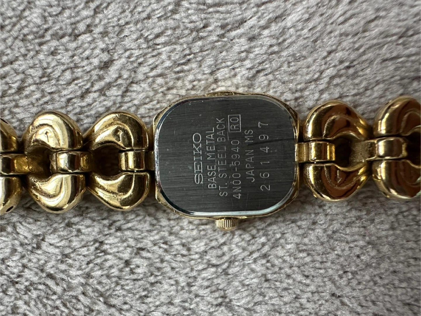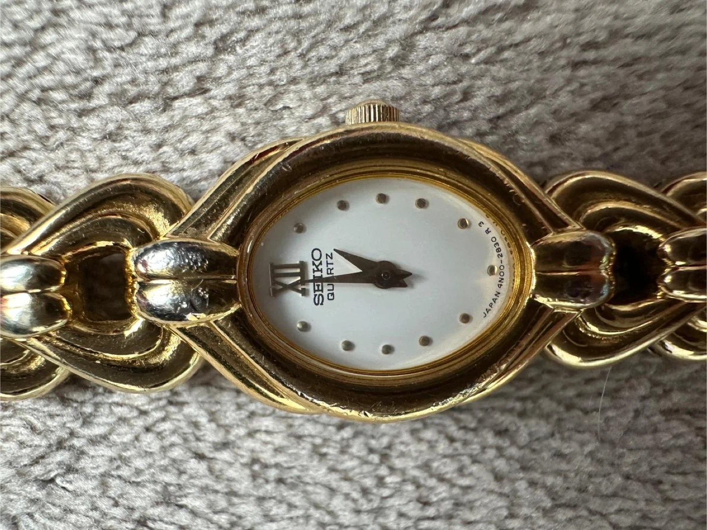 Selling a Seiko Quartz women's watch in gold. It's a beautiful timepiece with a unique woven band design. The back is stamped with "JAPAN O 03058 T". The face is white with Roman numerals at the 12 o'clock position. A stylish accessory for any occasion