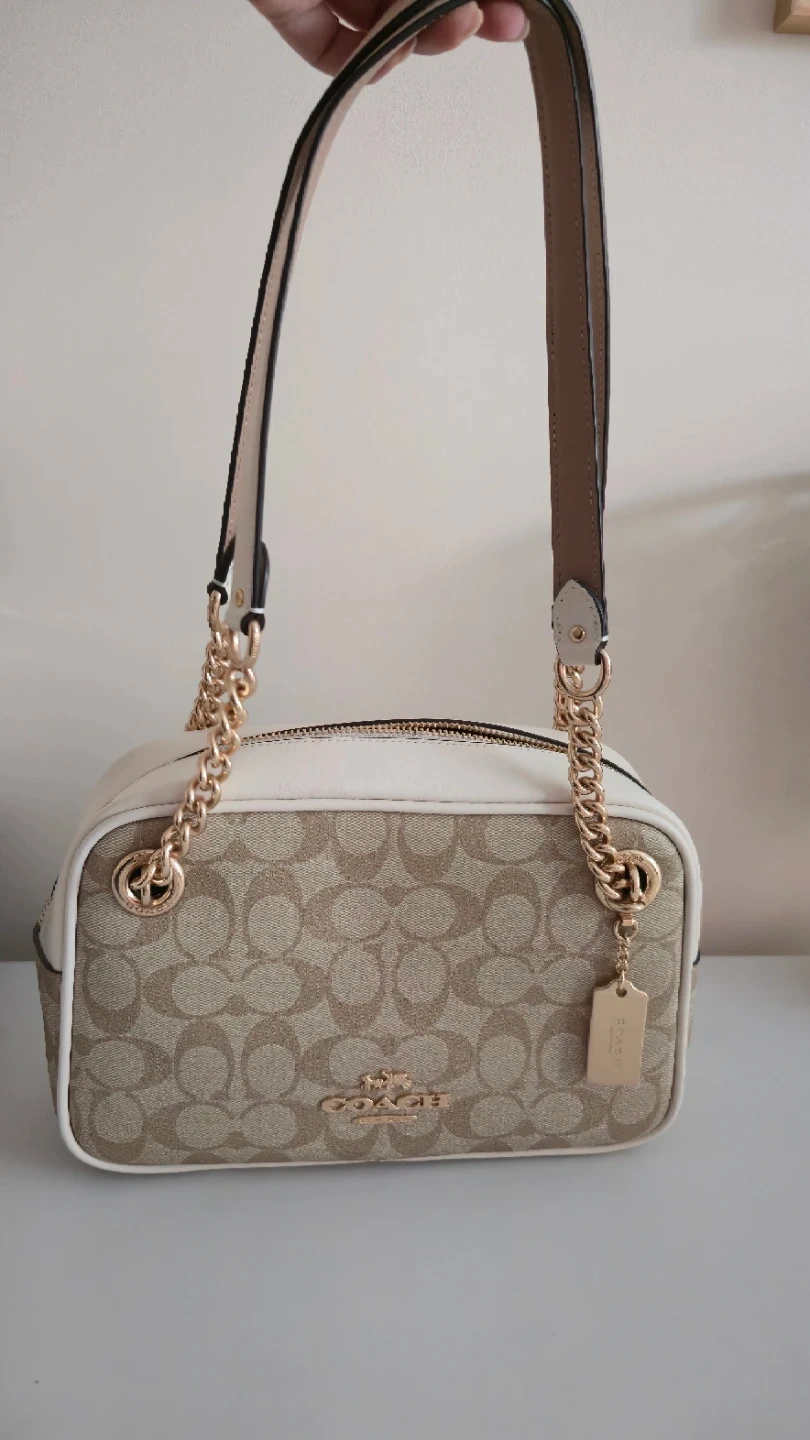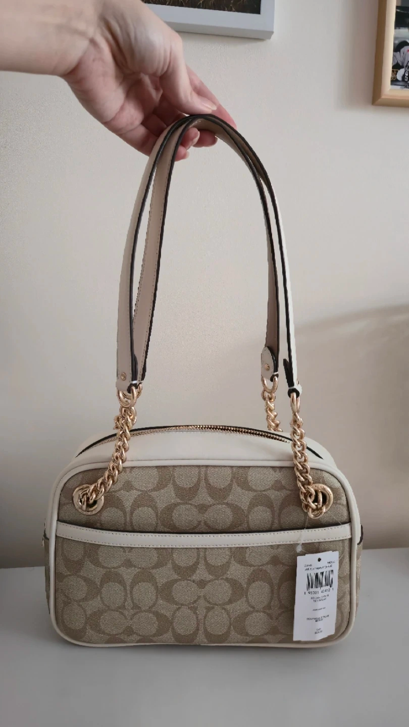 This is a Coach Signature camera bag in the Light Khaki and Chalk colourway. It's made with the brand's signature coated canvas and leather trim. Features a zip-top closure and a gold-tone chain strap. It is brand new, tags and stickers still on it.