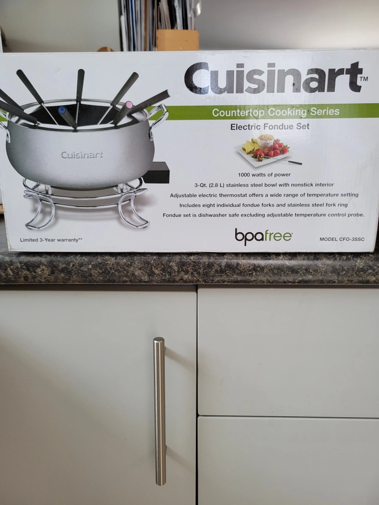 Cuisinart Electric Fondue Set. New in the box. 1000 watts of power. 3-quart (2.81 l) stainless steel bowl with non-stick interior. Adjustable electric thermostat offers a wide range of temperature settings. Includes eight individual fondue forks and stainless steel fork ring. Fondue set is dishwasher safe excluding adjustable temperature control probe.
