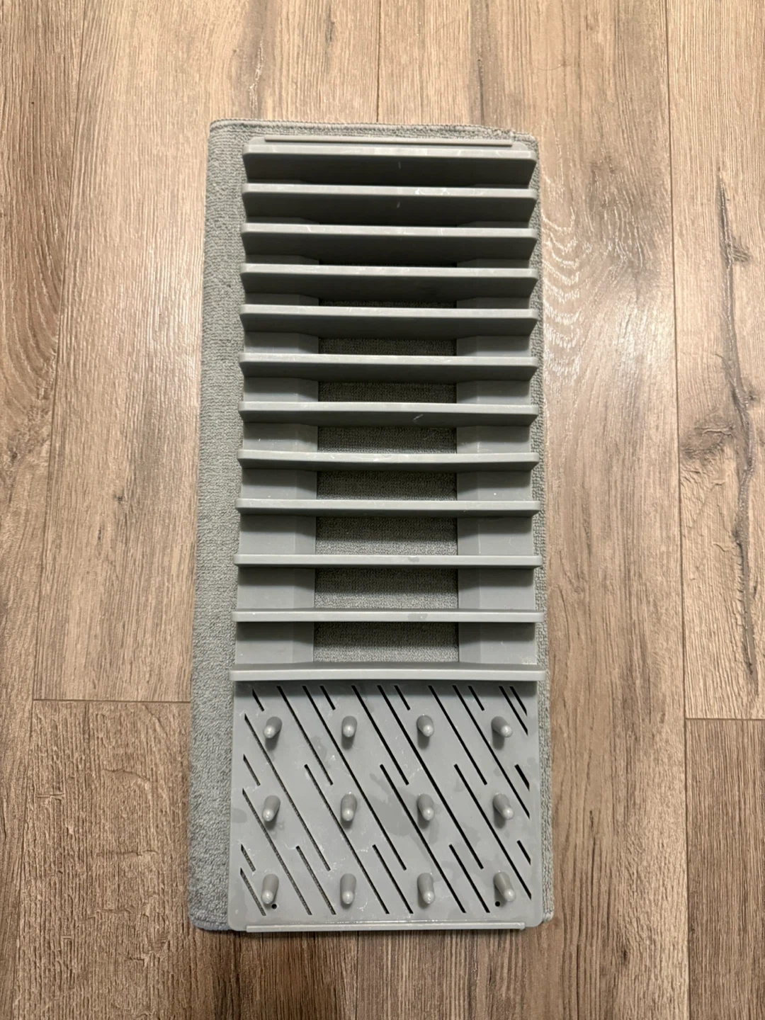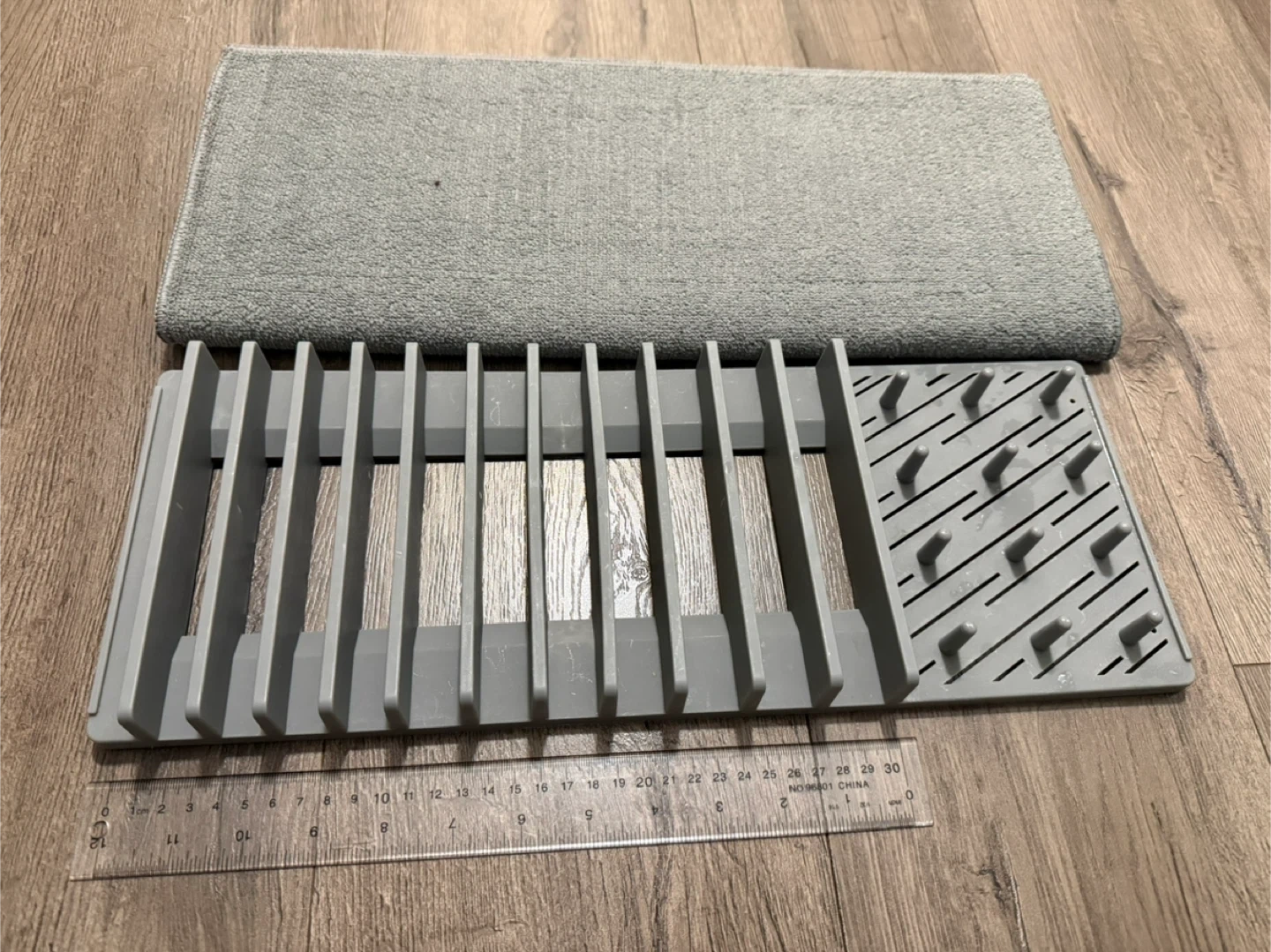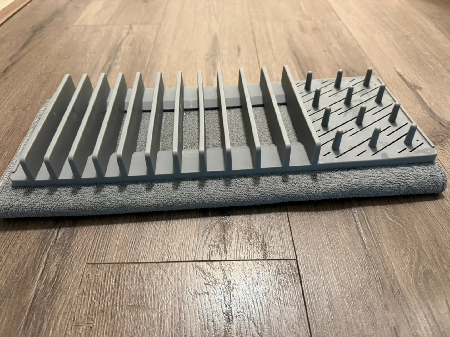 The rack has rows for plates and a section with pegs for cups and glasses.
