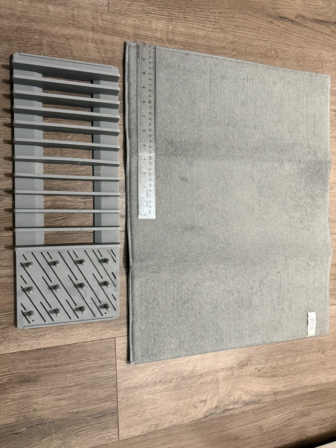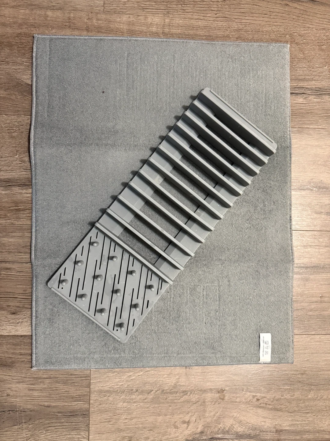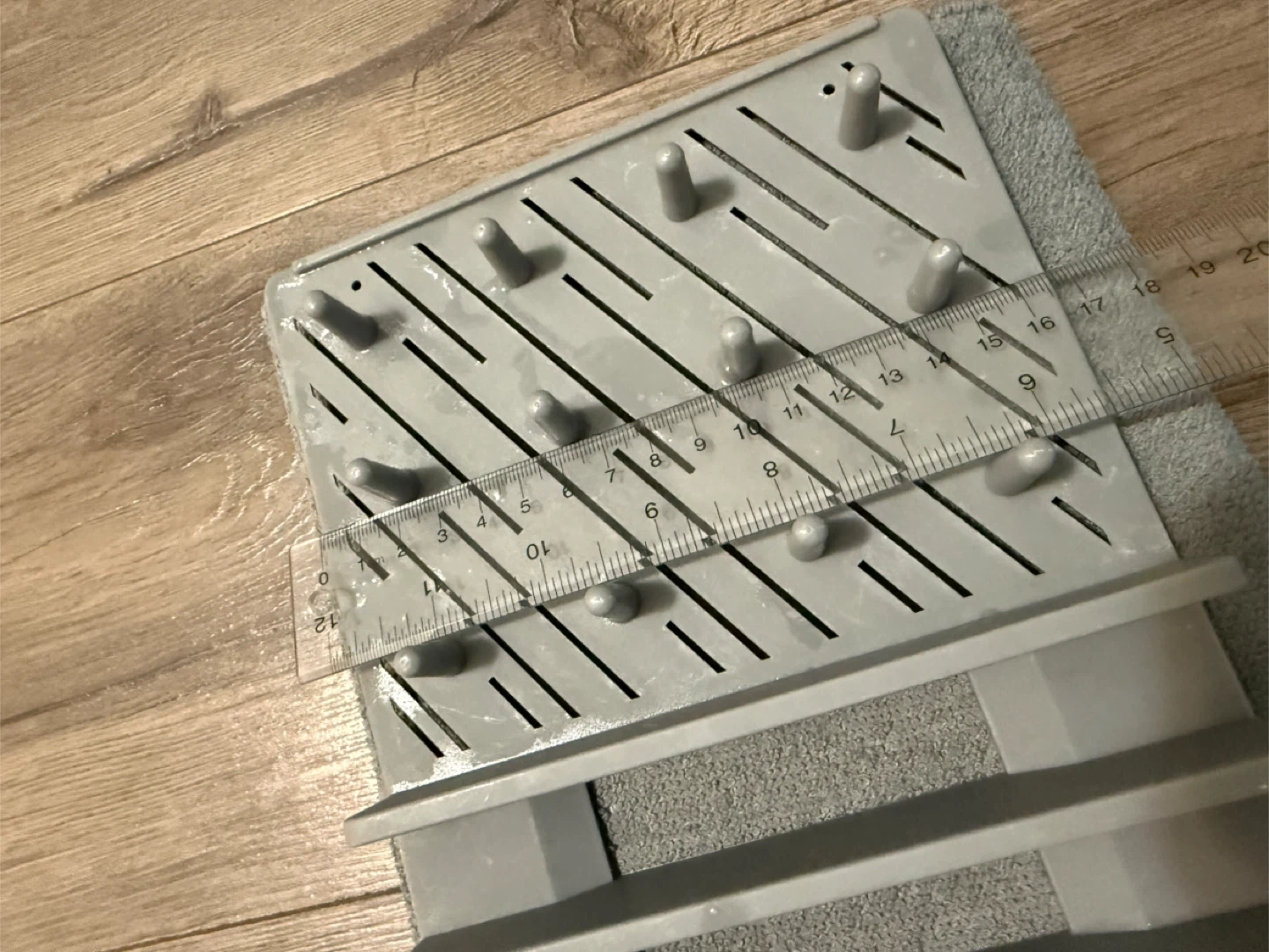 The rack has rows for plates and a section with pegs for cups and glasses.