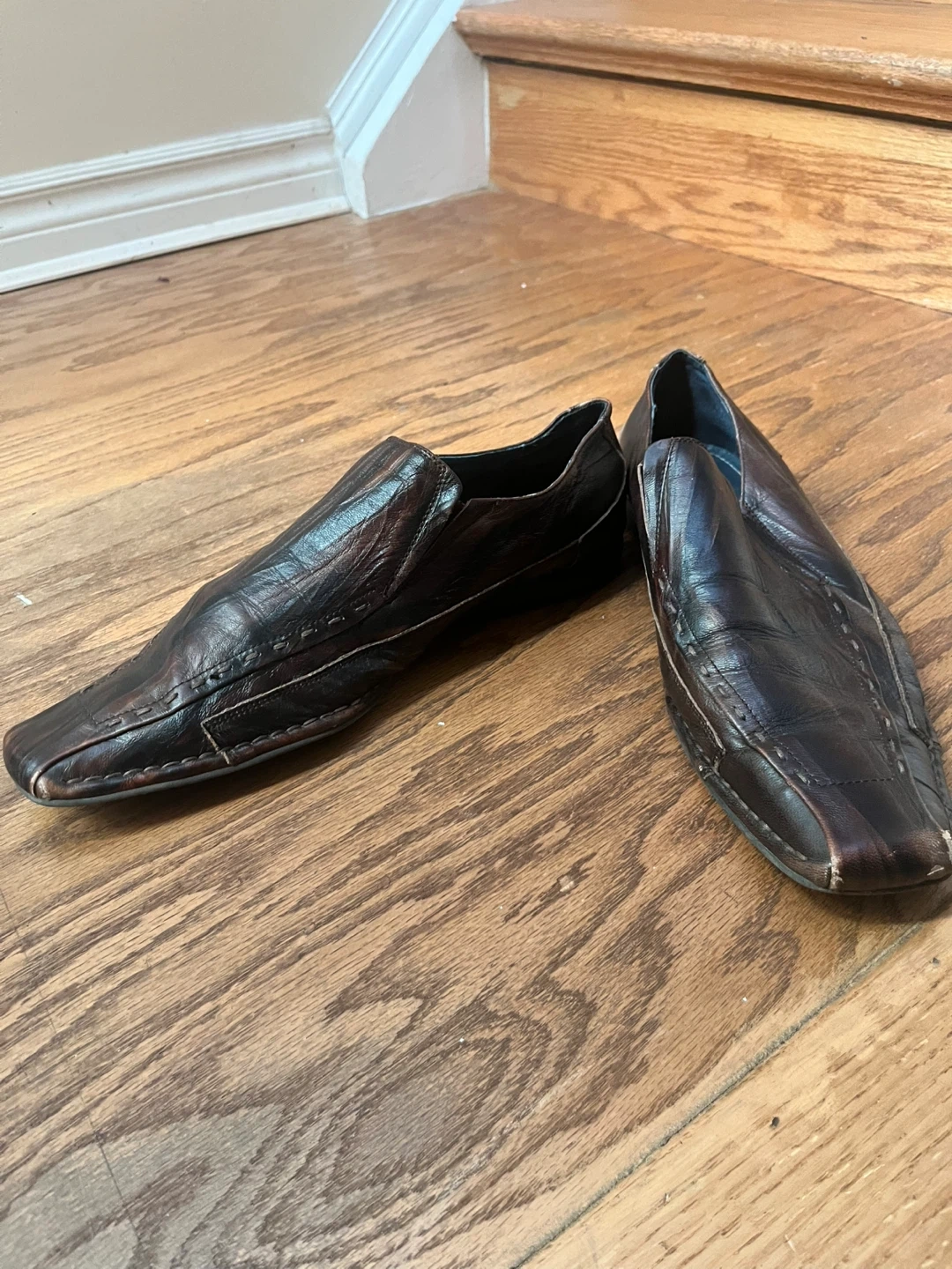 Stylish dark brown leather loafers for men. These shoes feature a square toe and intricate stitching detail. Leather upper and lining.
