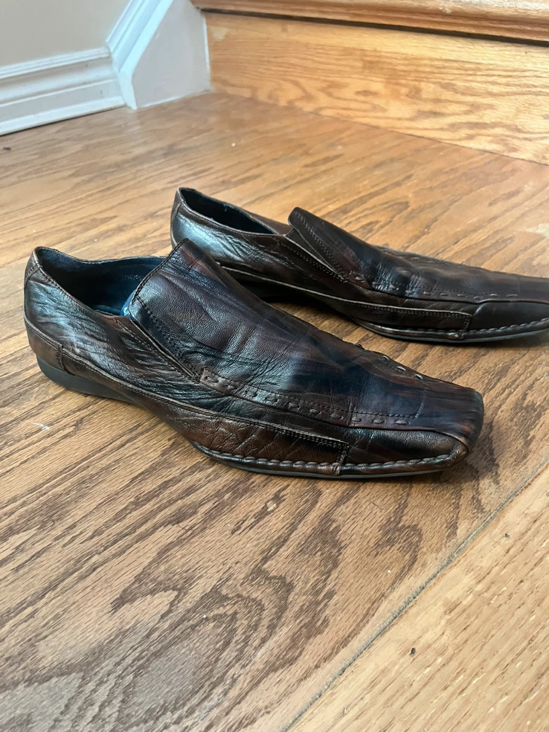 Stylish dark brown leather loafers for men. These shoes feature a square toe and intricate stitching detail. Leather upper and lining.