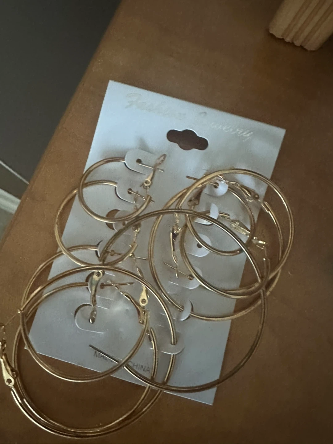 This set includes multiple pairs of gold tone hoop earrings. All earrings appear to be made of metal. They're on a card backing ready for display.