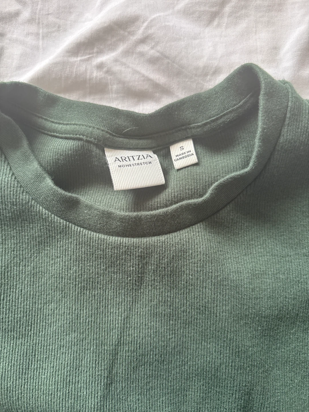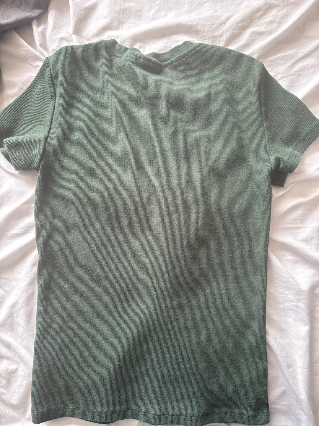 A green ribbed short sleeve t-shirt from Aritzia. Made from a stretch material. Size small. Campus green. Darker colour in person.