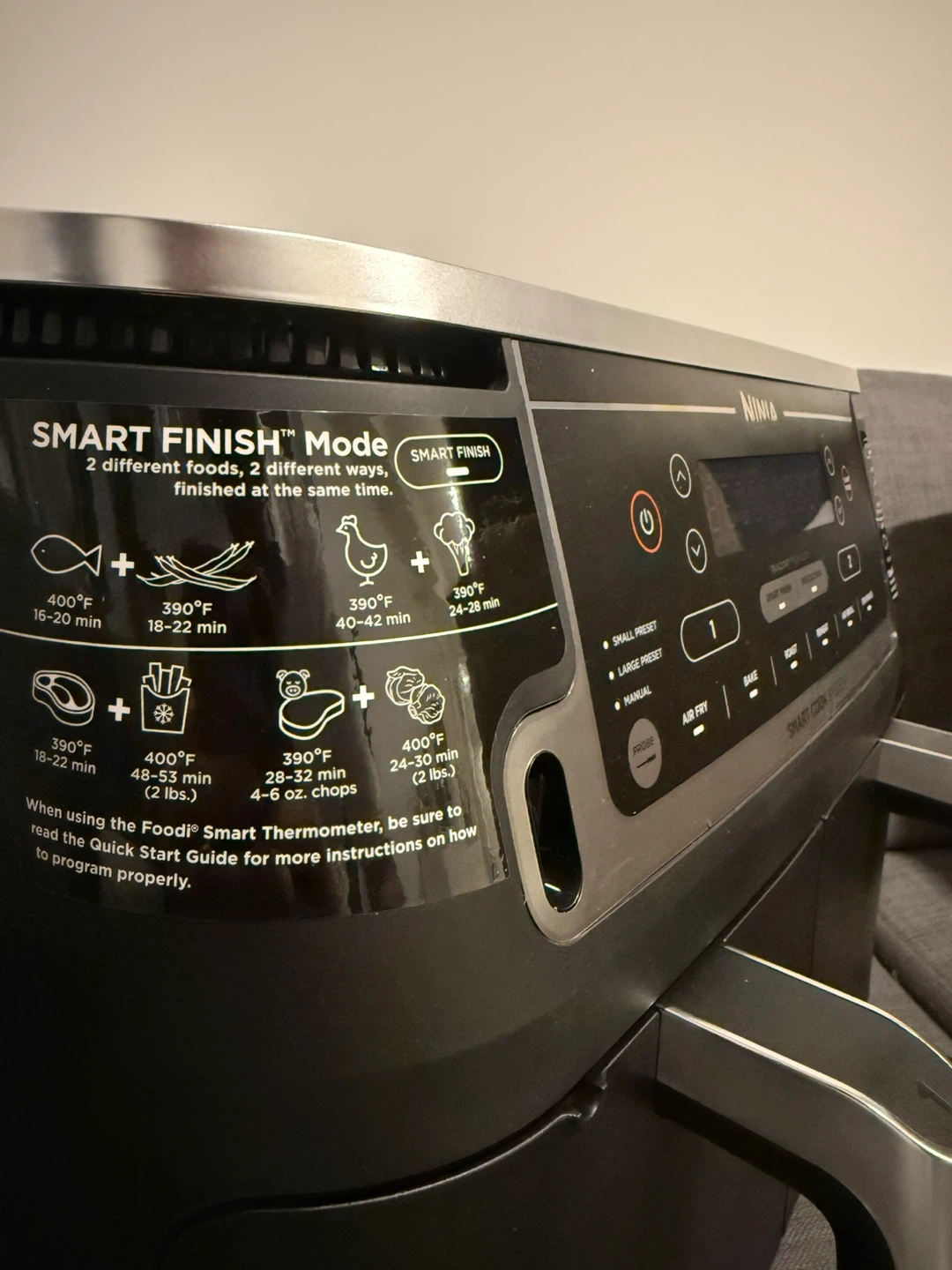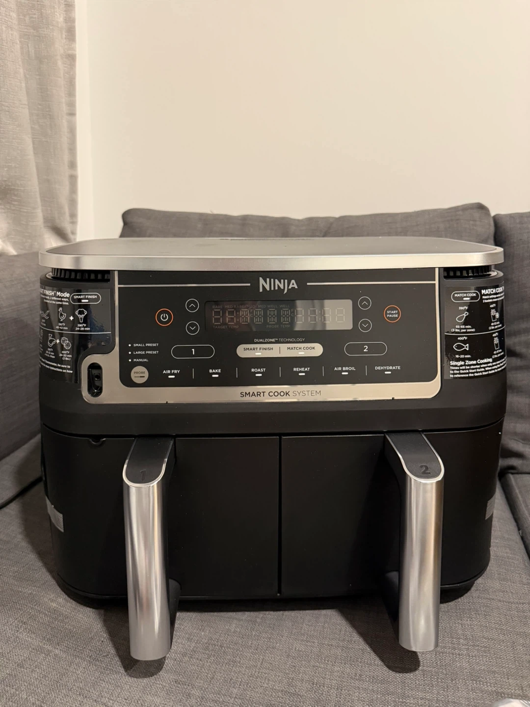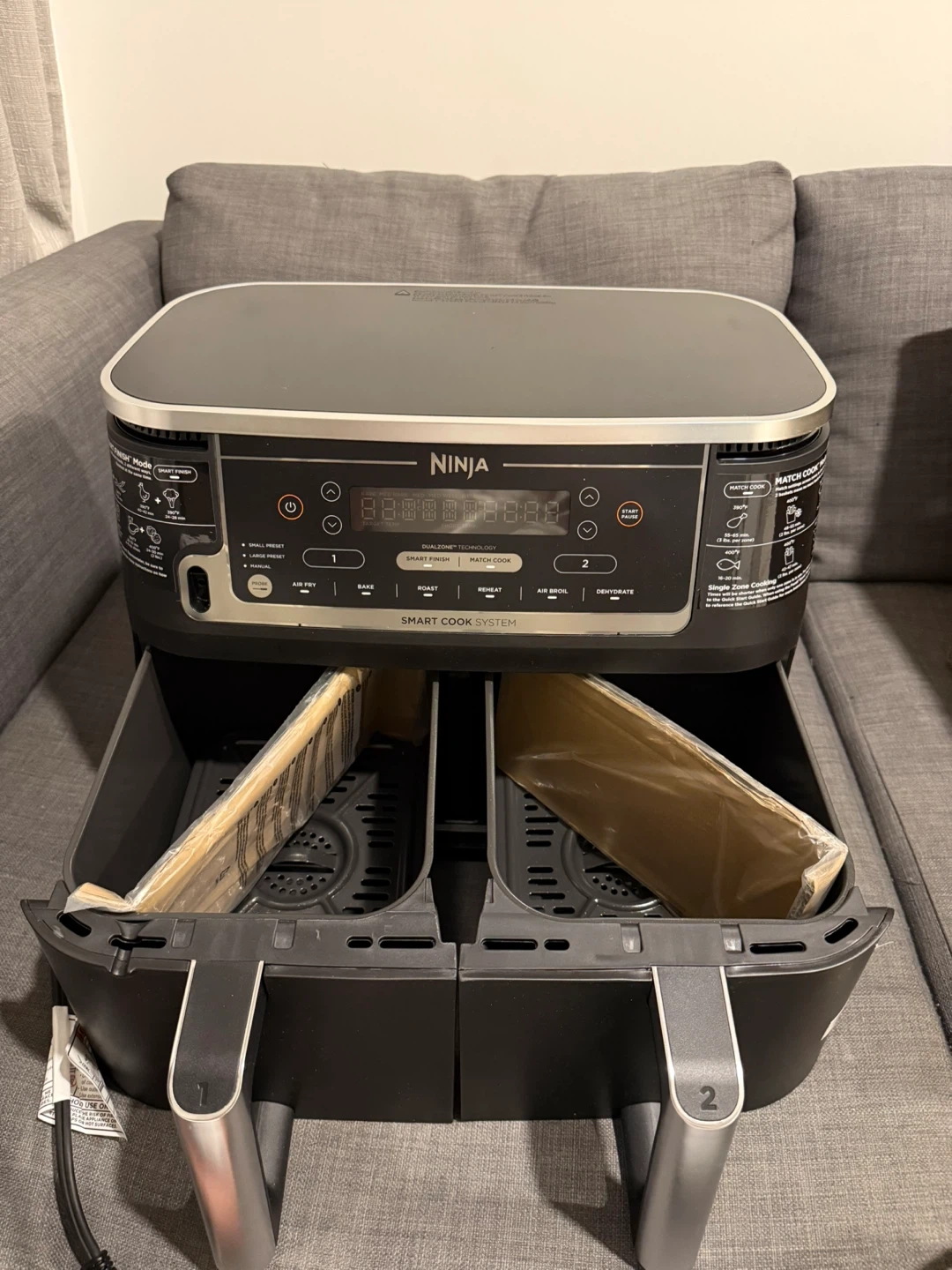 This Ninja Foodi 10-quart air fryer features a DualZone Smart Cook System. It offers 6 cooking functions: Air Fry, Bake, Roast, Broil, Reheat, and Dehydrate. It also has a Smart Finish feature for cooking two different foods at once. Comes with a smart cook thermometer. It is fully functional but the base of the first container has a crack. That’s how Amazon delivered it and I barely used it twice, works like brand new.