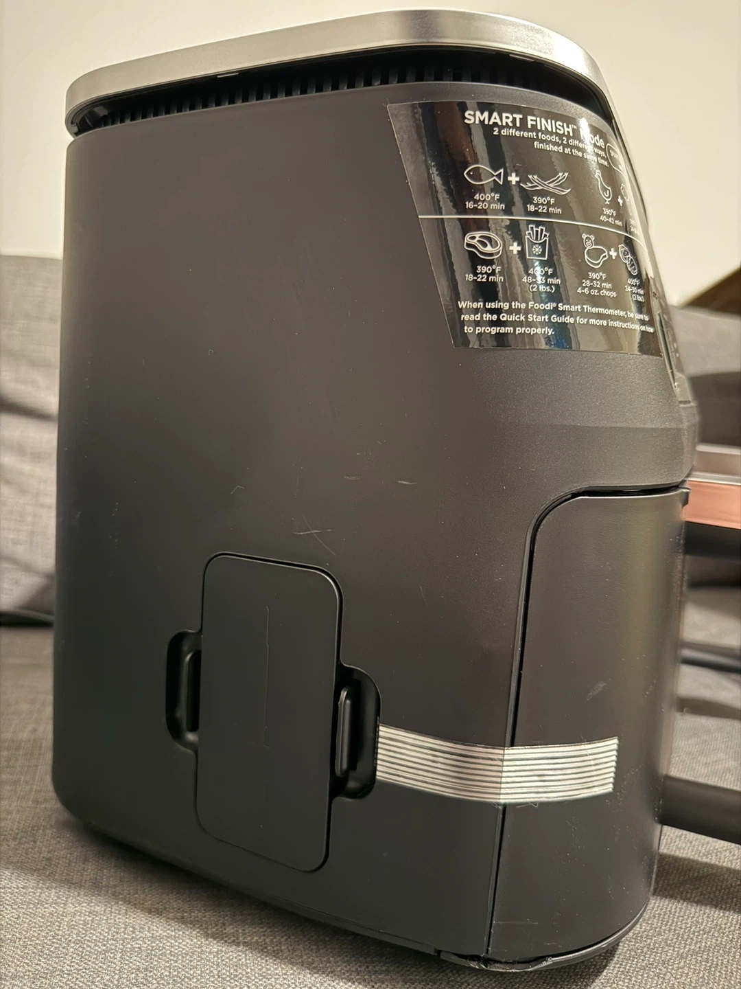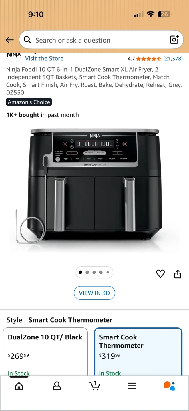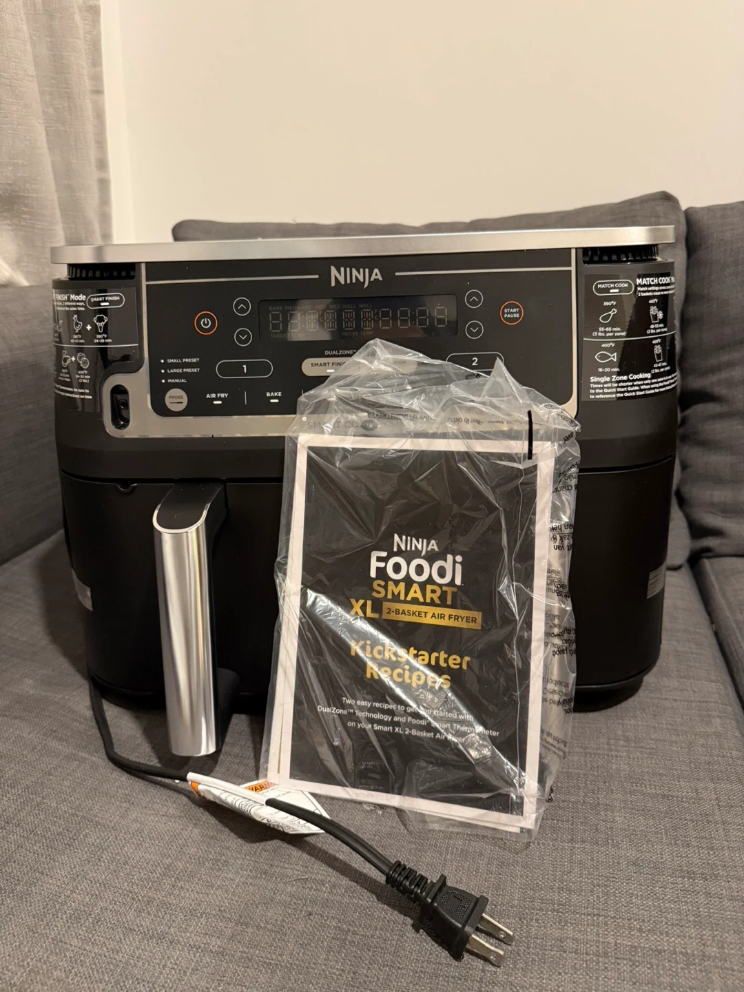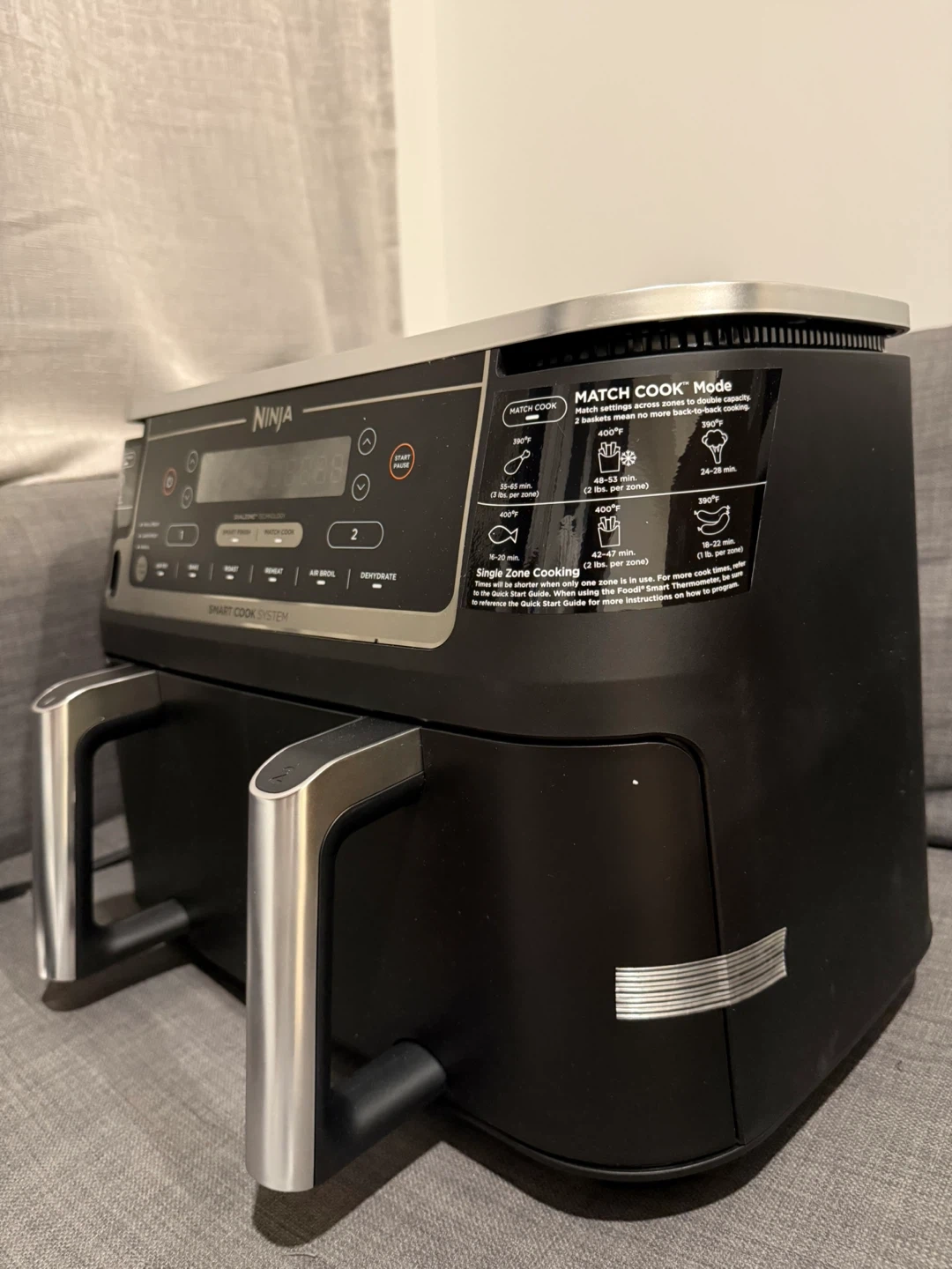 This Ninja Foodi 10-quart air fryer features a DualZone Smart Cook System. It offers 6 cooking functions: Air Fry, Bake, Roast, Broil, Reheat, and Dehydrate. It also has a Smart Finish feature for cooking two different foods at once. Comes with a smart cook thermometer. It is fully functional but the base of the first container has a crack. That’s how Amazon delivered it and I barely used it twice, works like brand new.