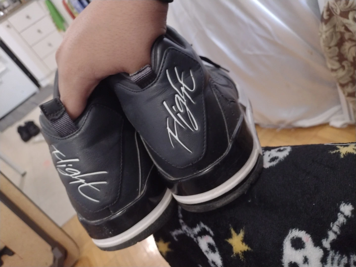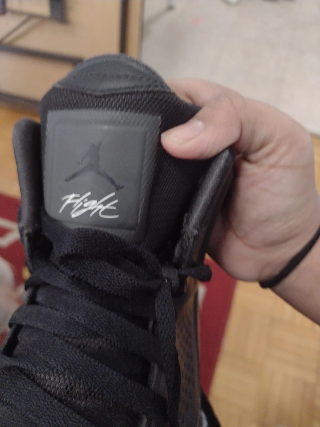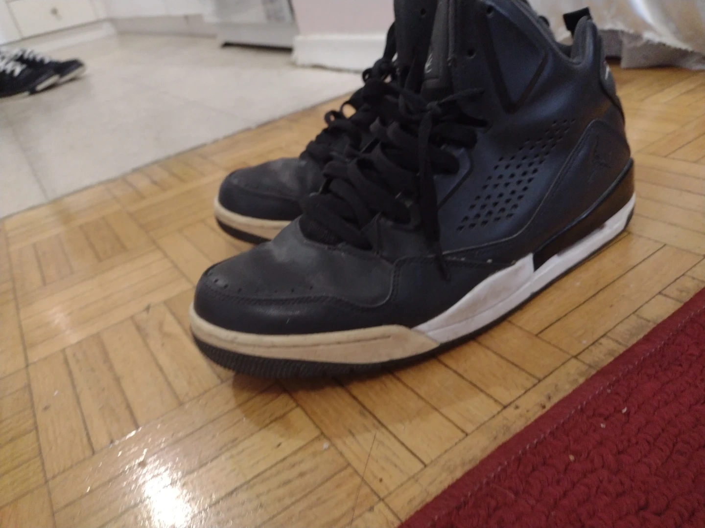 Black high-top Jordan Flight sneakers with white accents. These shoes are made with leather and feature perforated details. Laces are black.