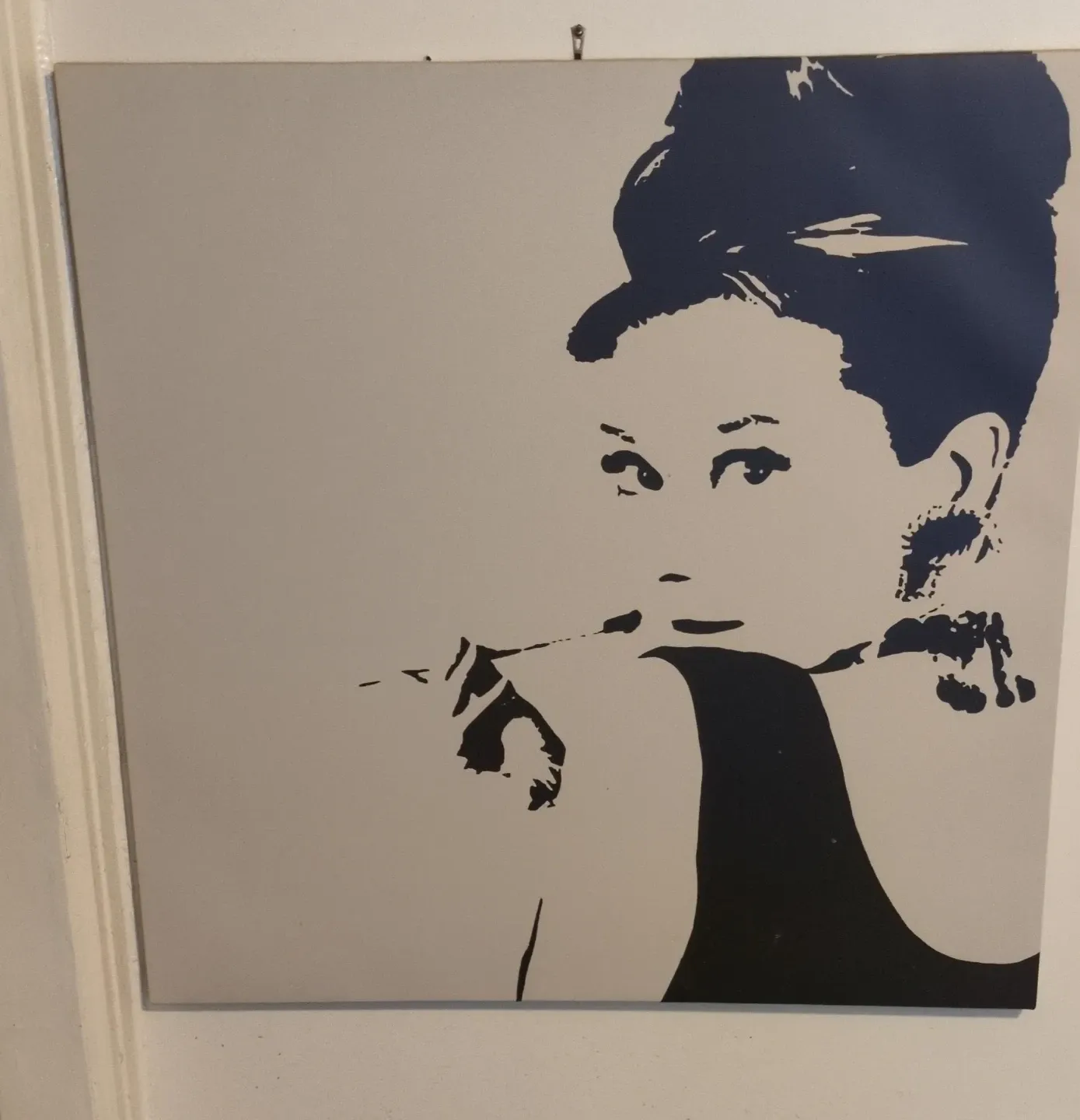 This is a stencil art print of Audrey Hepburn. The artwork features a silhouette of her face with a cigarette holder. It's a classic and stylish piece for home decor. 35 1/2" X 35 1/2".