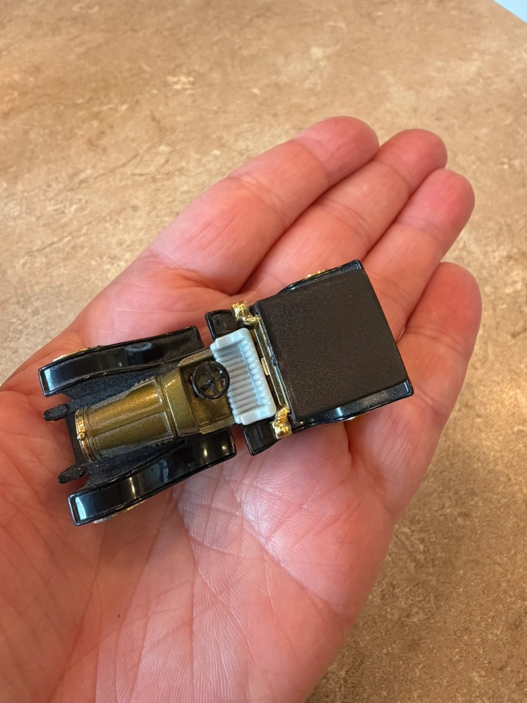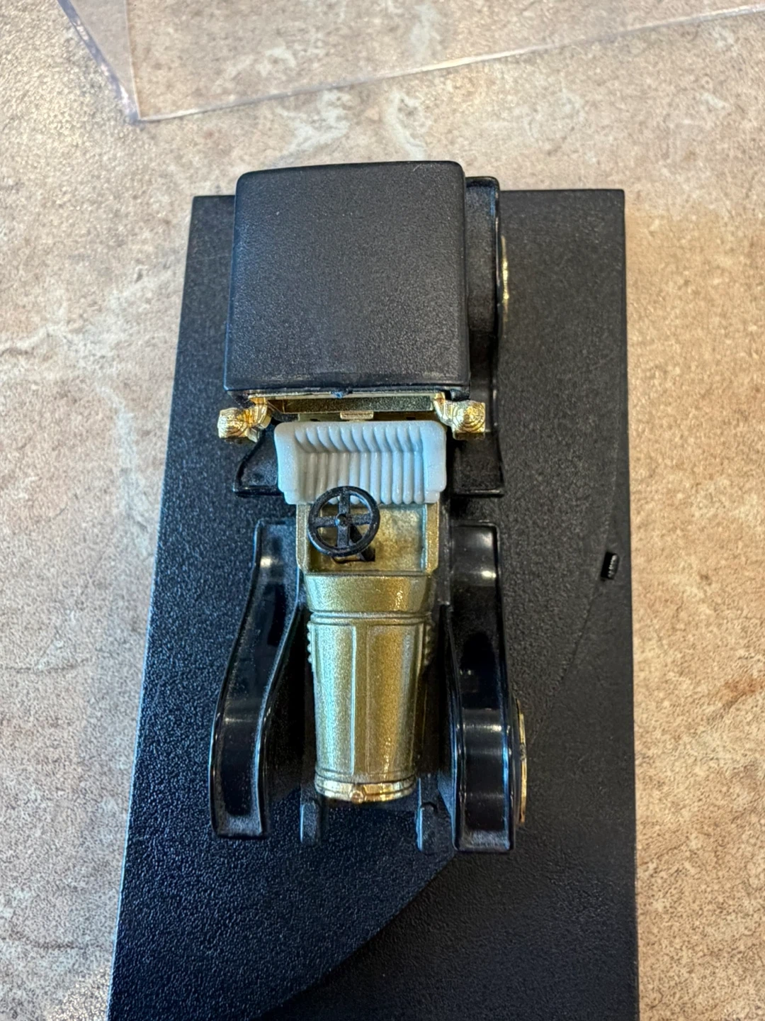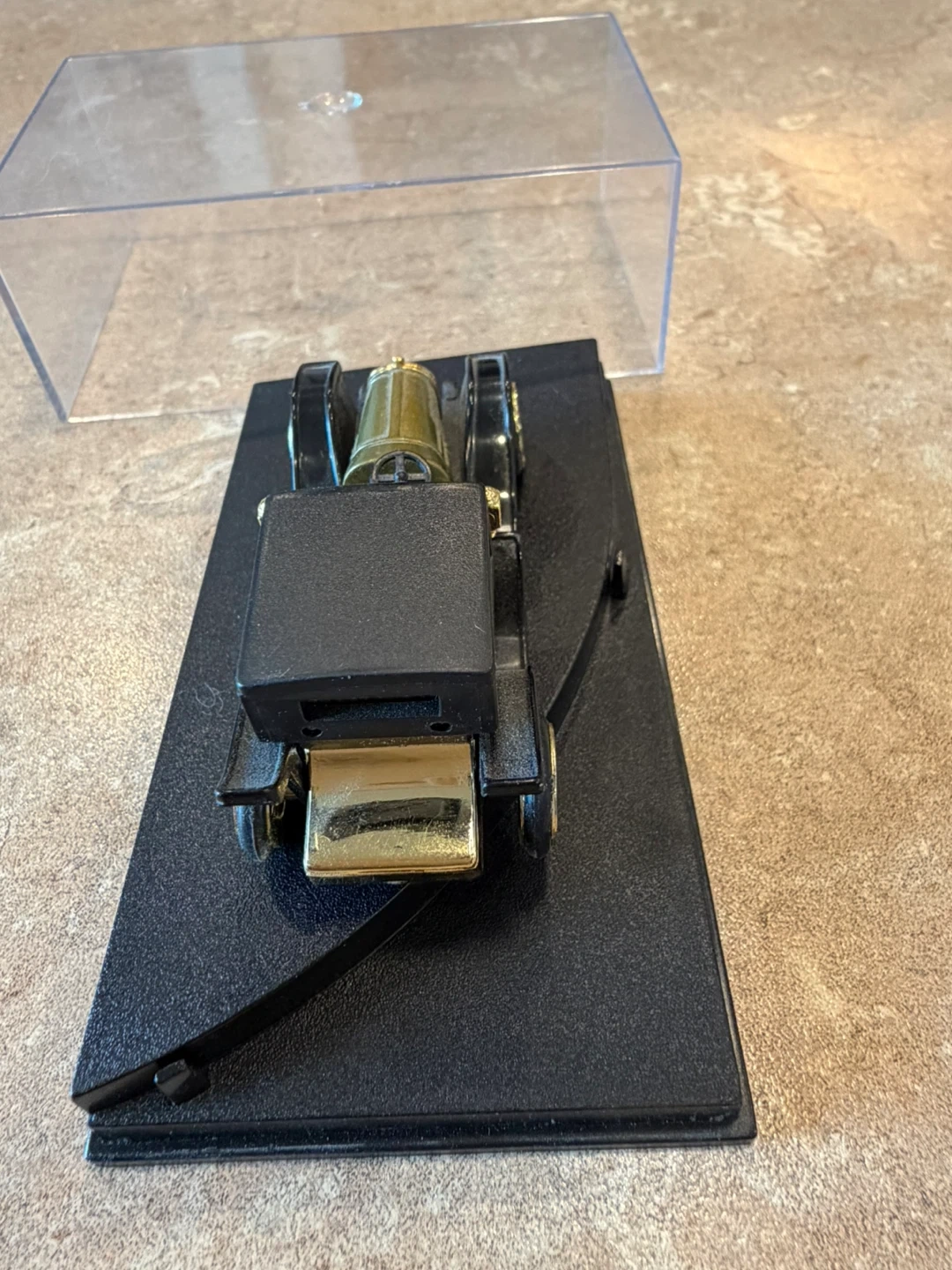 This is a detailed toy car model featuring a black body with gold accents. It's displayed on a black base with a clear protective cover. The car has intricate details like a steering wheel and seats.