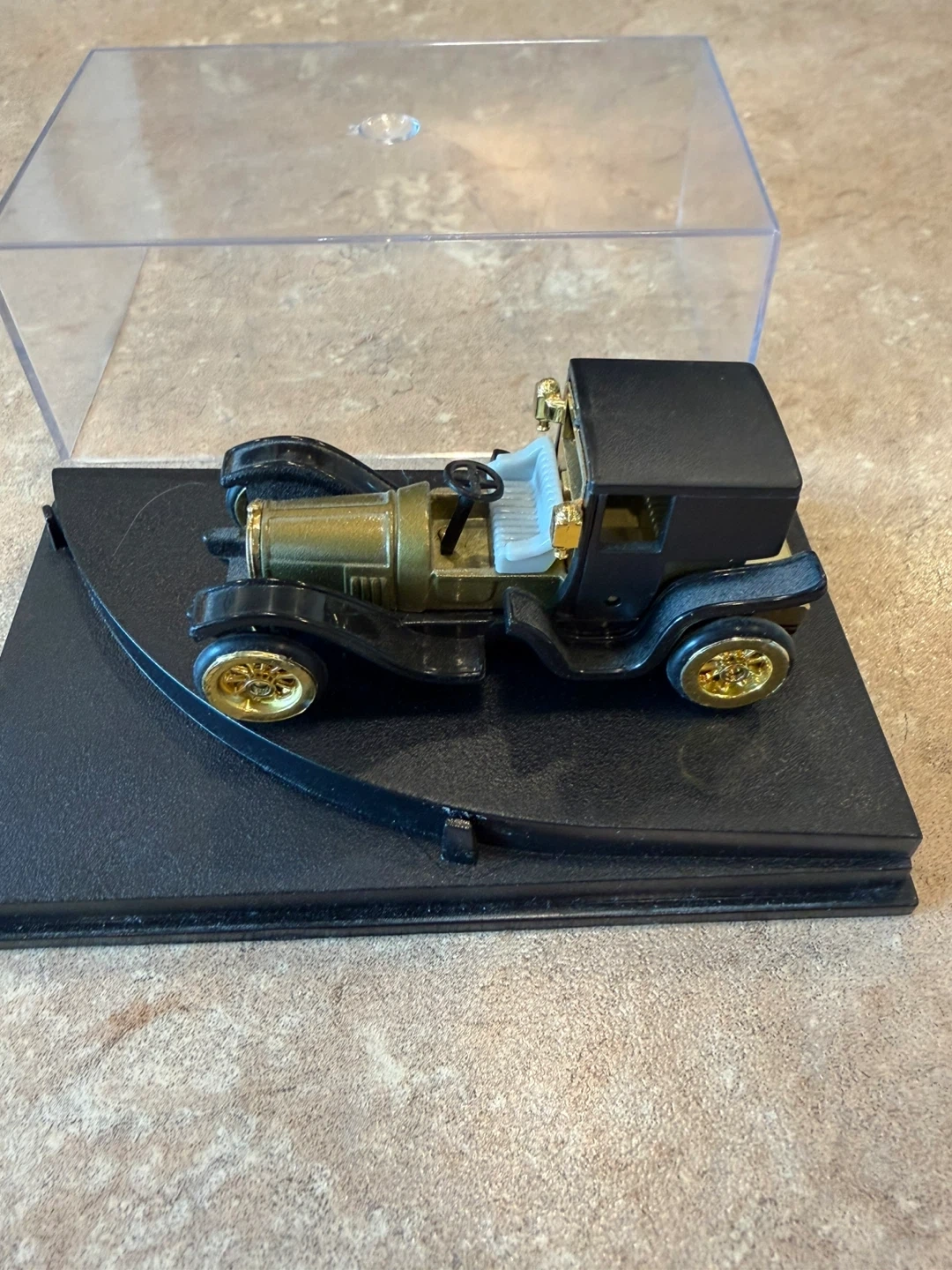 This is a detailed toy car model featuring a black body with gold accents. It's displayed on a black base with a clear protective cover. The car has intricate details like a steering wheel and seats.