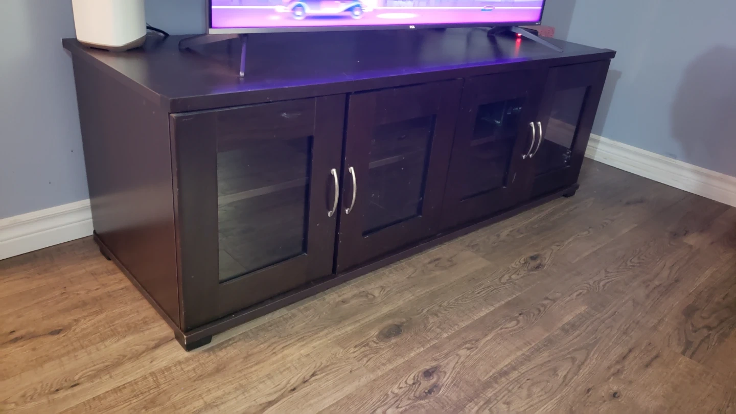 Here's a dark wood tv unit, it's in overall pretty good condition, and it has glass doors with middle shelves. There's only one minor issue, which is that on the back of two doors, the original plastic retainer clips which hold the glass against the door have broken off and should be replaced to avoid the glass falling out the back. It's an easy fix though and they only cost a few dollars.