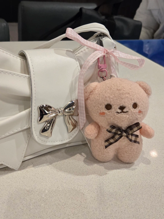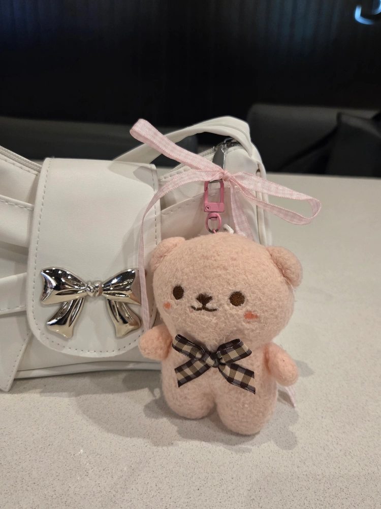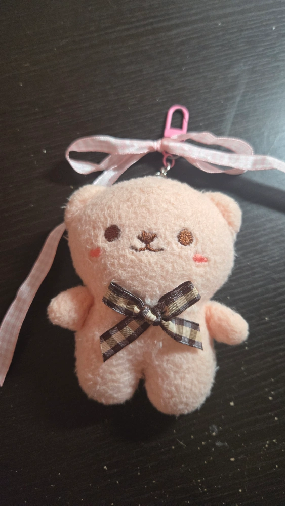 This is a cute pink teddy bear keychain. It has a little brown and black bow and a pink ribbon. It's in great condition and ready to add some charm to your bag or keys