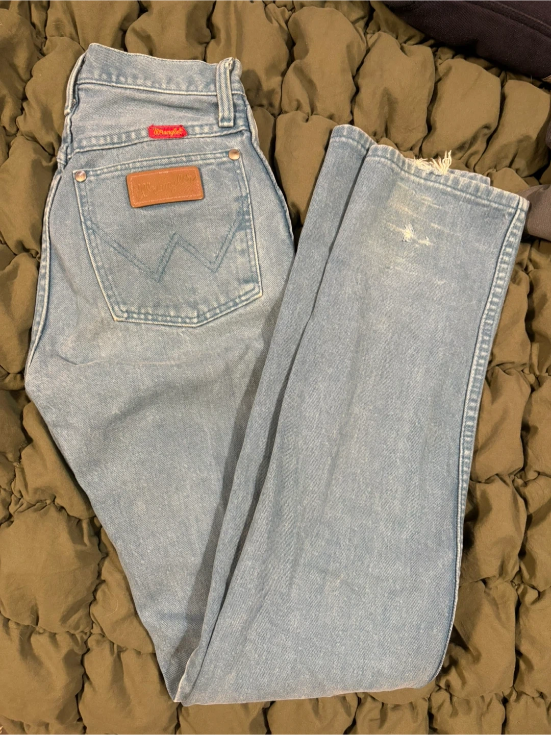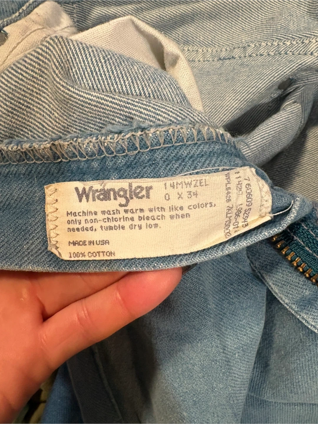 Selling a pair of Wrangler jeans in size 0 x 34. They're made of 100% cotton and are a light wash colour. The tag indicates they can be machine washed warm with like colours and tumble dried on low
