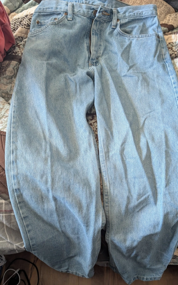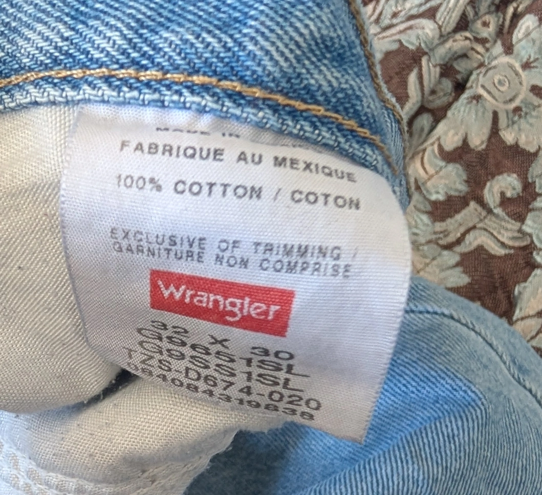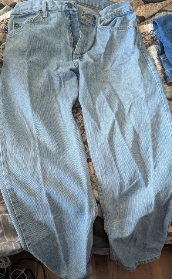 Selling a pair of light wash Wrangler jeans. They are size 32x30 and made of 100% cotton. Perfect for casual wear!