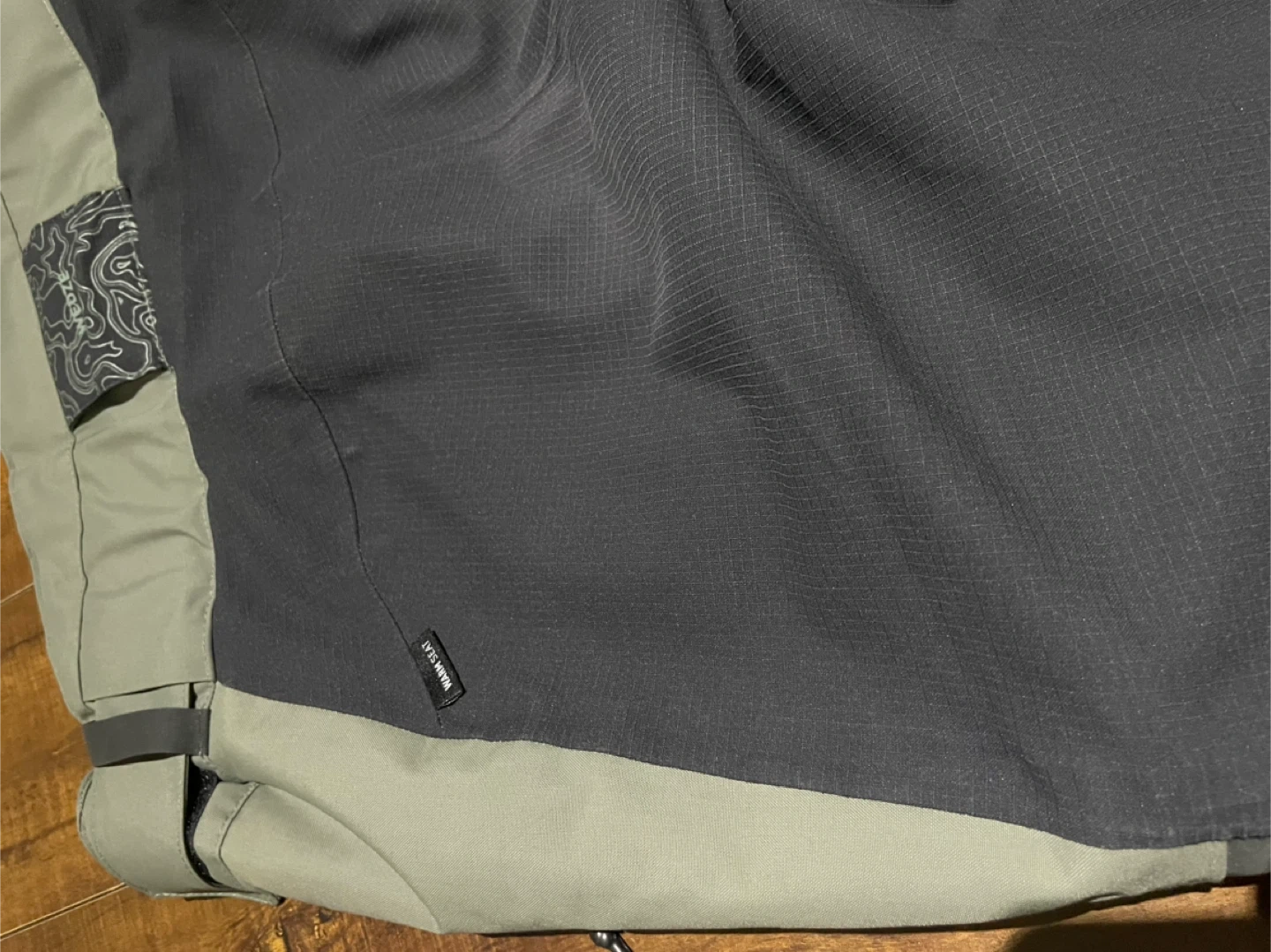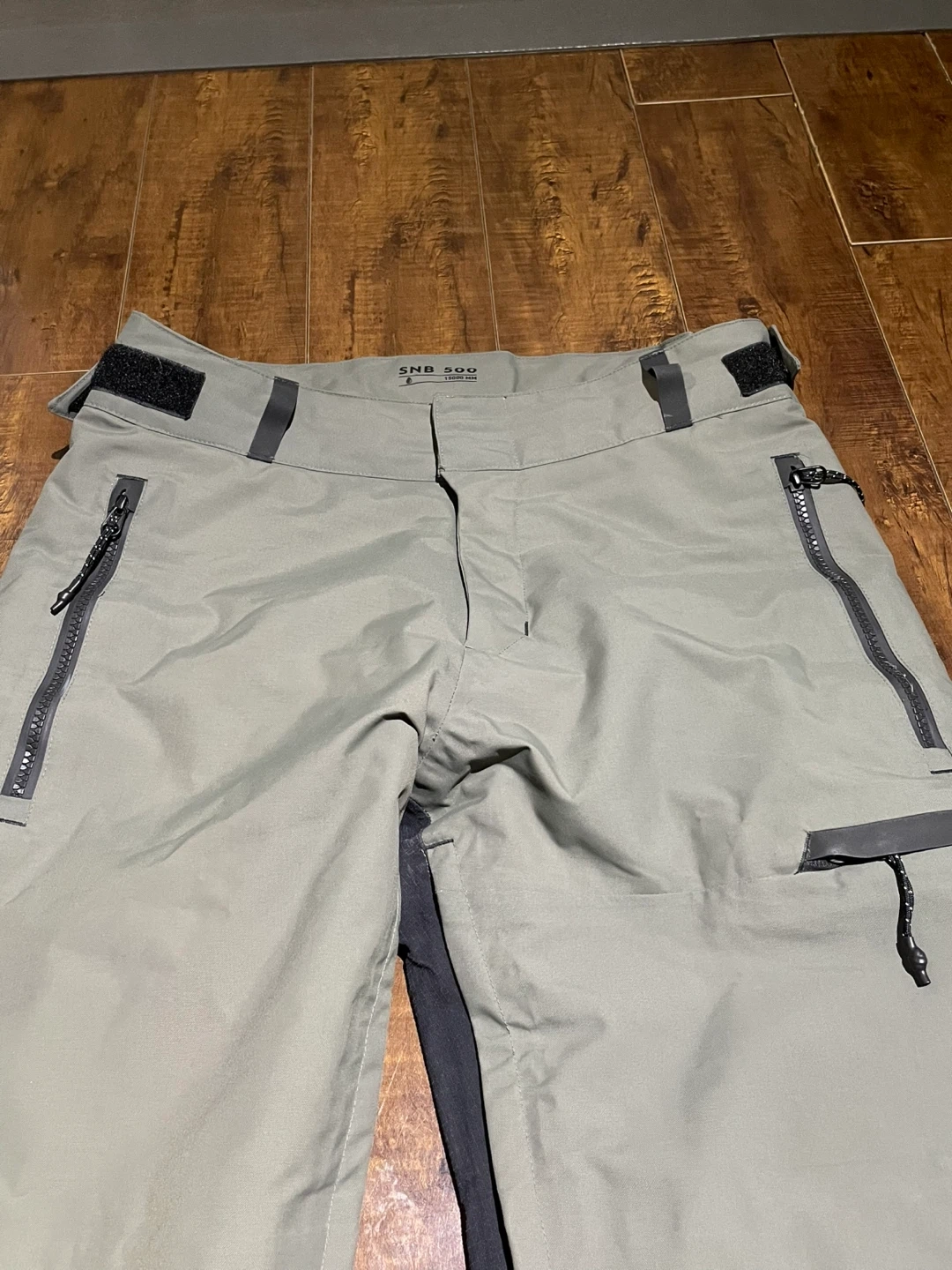 Men’s Warm, Waterproof Snowboard Trousers SNB 500. They feature a black, grey, and olive colourway with zippered pockets. These pants are built for the slopes!
