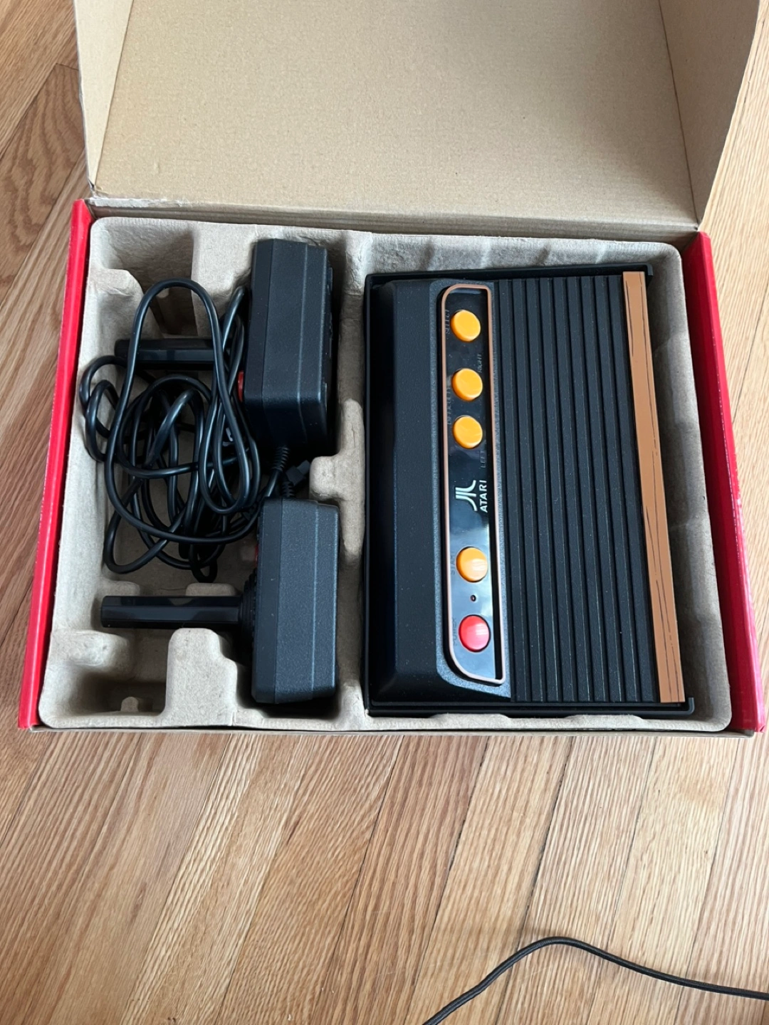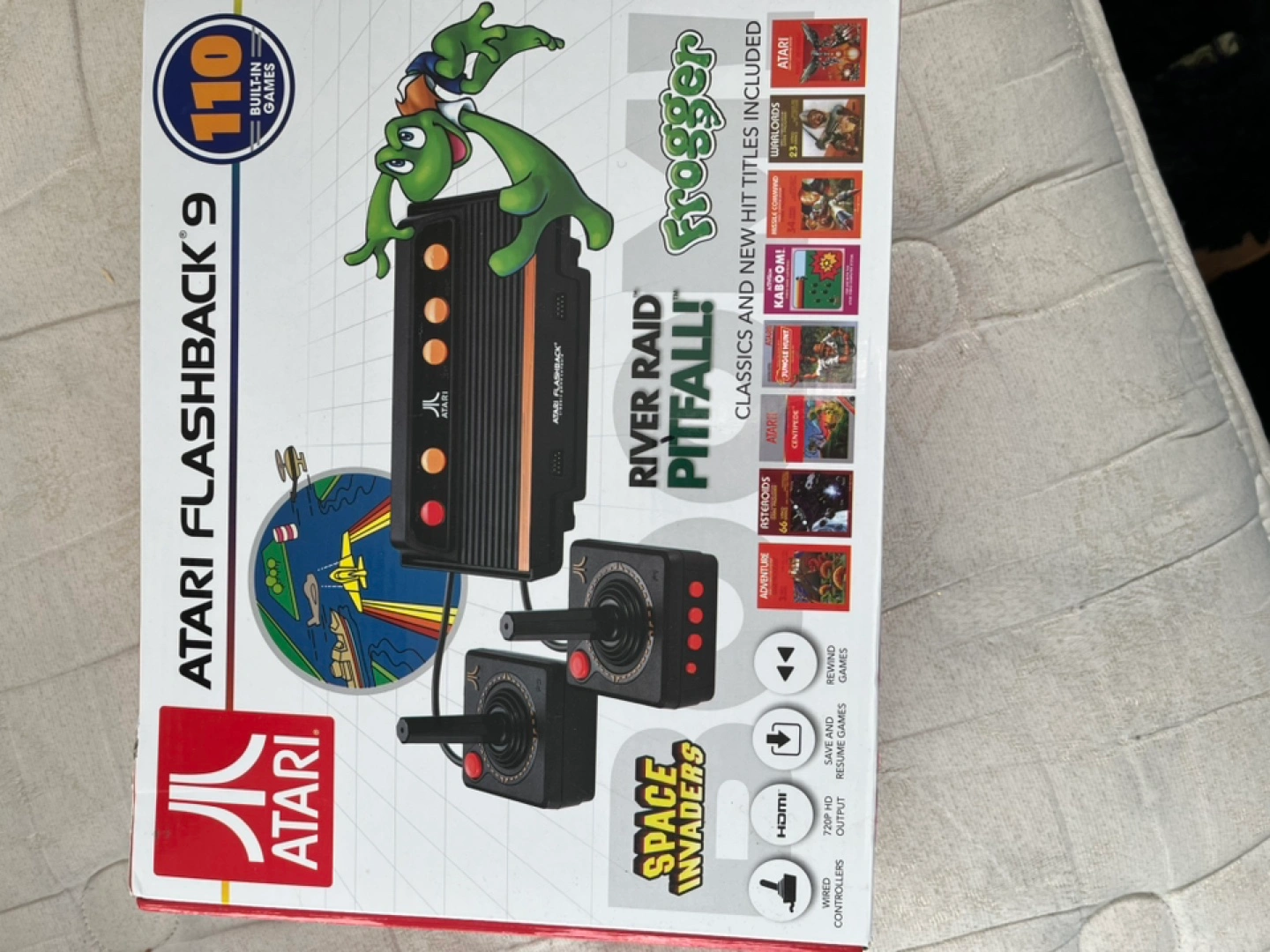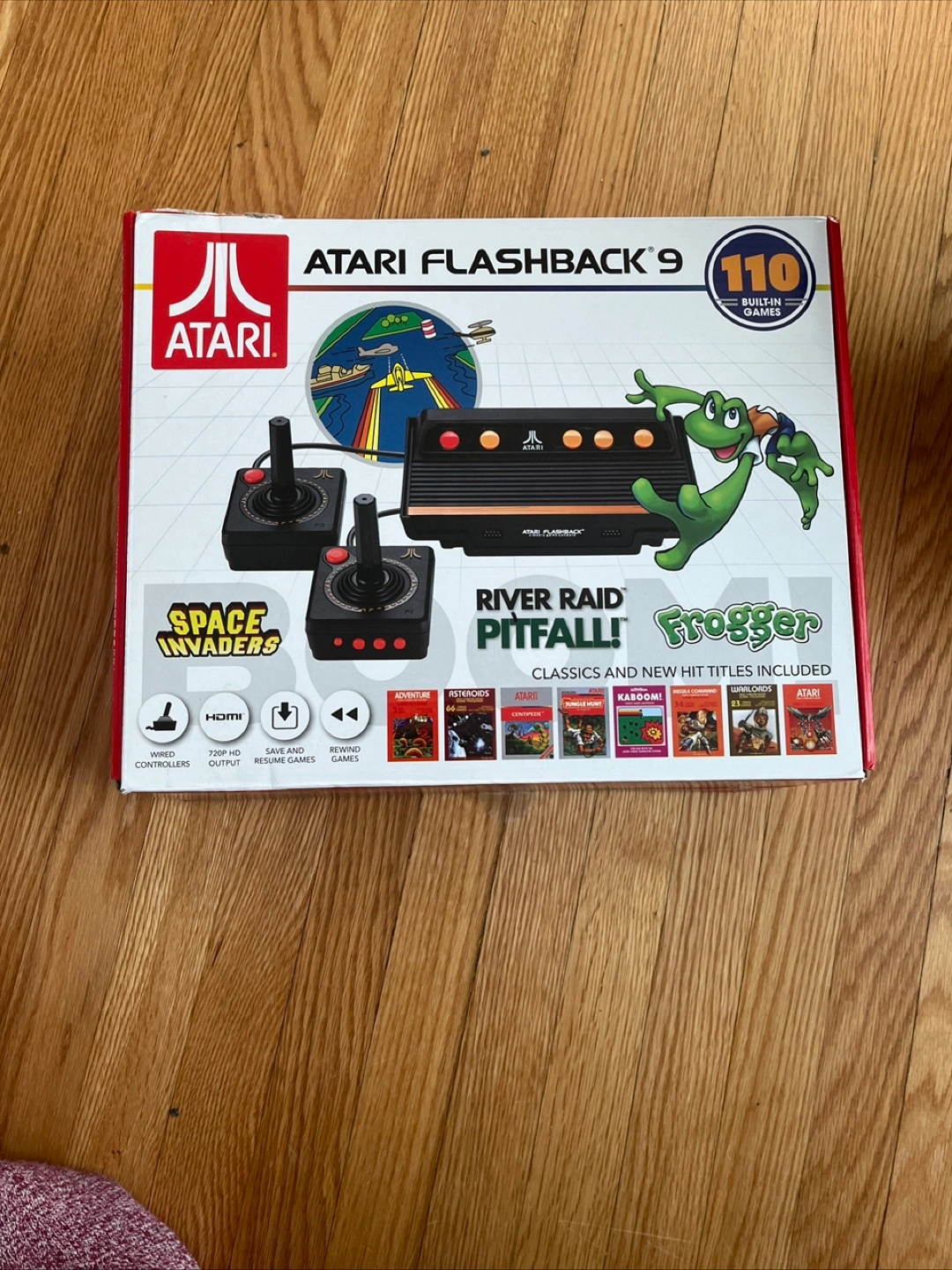 Atari Flashback 9 gaming console. Includes two wired controllers. Features 110 built-in games, including classics and new titles. 720p HD output. Save and rewind functionality. Great condition.