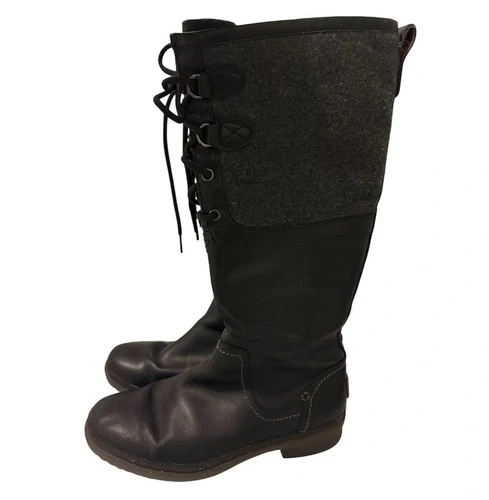 UGG Women's Elsa Tall Boots, a waterproof style featuring a blend of leather and a wool-blend textile upper. They feature decorative lacing at the top of the shaft and a functional medial side zipper for easy wear. The boots are lined with UGGpure™ wool for warmth and have a durable, cork-infused Spider Rubber outsole for enhanced traction in slippery conditions. They are designed as a stylish, yet functional, option for cold or rainy weather, offering a more feminine silhouette than traditional bulky snow boots. The lower section of the boot is made from a waterproof black leather, while the upper shaft is a grey wool-blend textile. Condition is excellent, please see all photos.