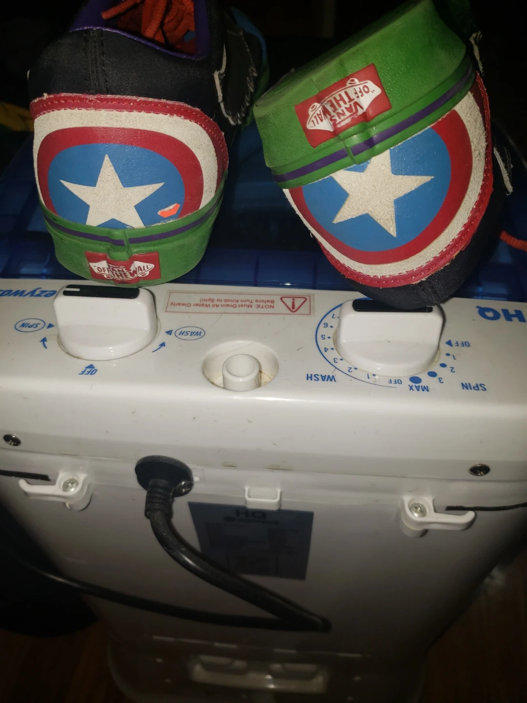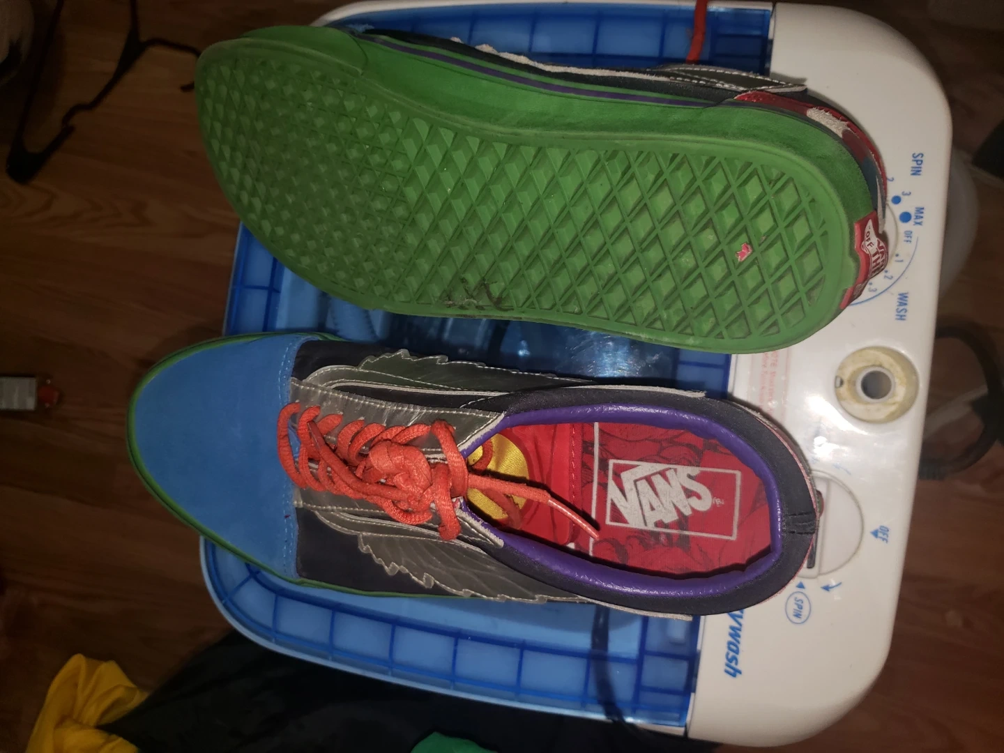 size 10 Vans Old Skool sneakers featuring a Captain America shield design. They have a mix of blue, green, and black uppers with red laces. The soles are bright green with the classic Vans "Off the Wall" logo.