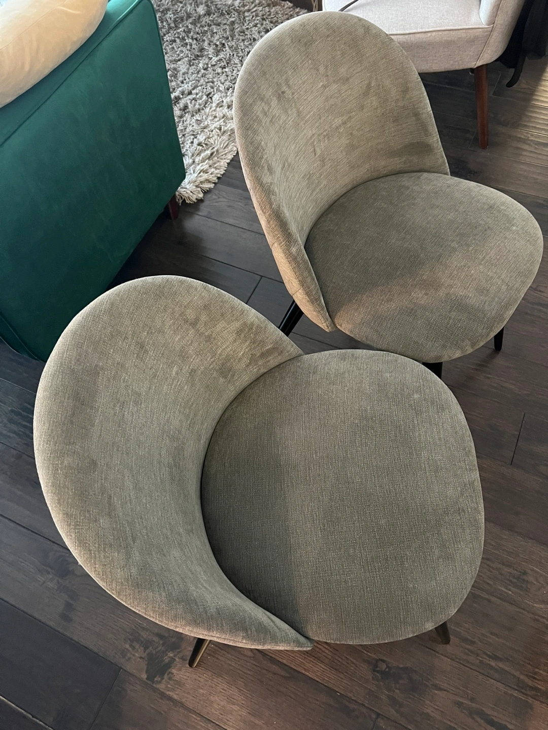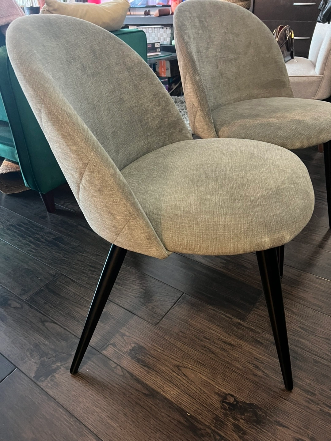 A set of two accent chairs upholstered in a grey fabric. These chairs have modern black tapered legs. They're comfy for extra seating in any room!